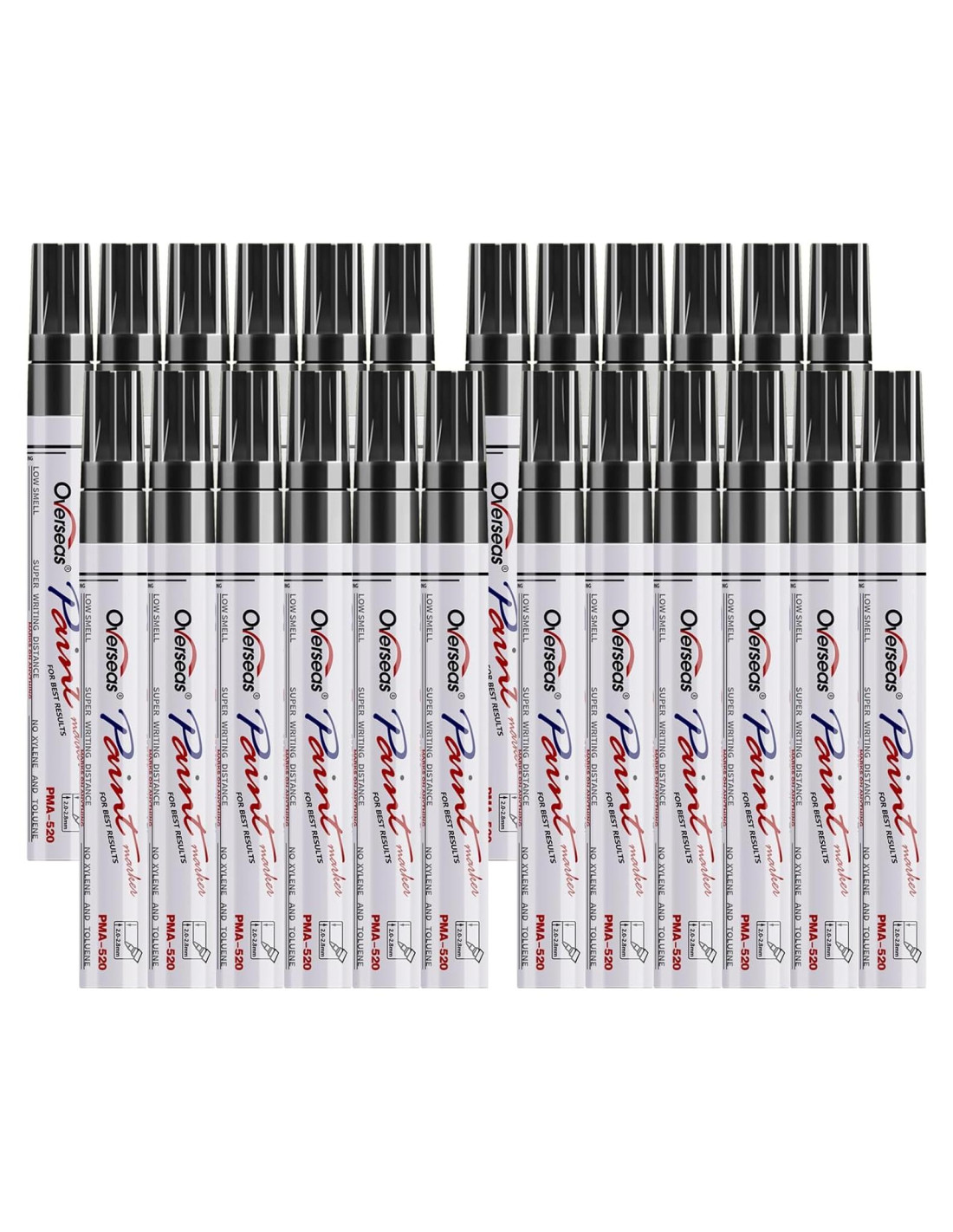 Marcadores Permanentes Negros, Marcadores de Pintura a Base de Aceite, Paquete de 24 ¿Por qué elegir los marcadores de pintura Overseas? -Marcadores permanentes a base de aceite, impermeables, de secado rápido y opacos. Adecuados tanto para el hogar como para la oficina. -Punta media duradera. Se puede trabajar en vidrio, papel, pintura en piedra, cartón, tela, caucho, plástico, lienzo, cuero, metal, latón, madera, piedra, neumático, etc. Casi todas las superficies. Cómo usar los marcadores de pintura 1) Agita bien el marcador. 2) Sostén el marcador con la punta hacia arriba y presiónalo para liberar el aire. 3) Presiona la punta hacia abajo varias veces hasta que la pintura comience a fluir. 4) ¡Ahora estás listo para escribir en cualquier superficie! -Usa alcohol mineral o trementina para limpiar. Descripción -Sin xileno ni tolueno. -Adecuado para múltiples superficies. -Pintura a base de aceite, no transparente. -La tinta cumple con EN71-3 y ASTM D-4236. -La tinta cumple con la directiva RoHS de la Unión Europea. -La punta del marcador mide aproximadamente 2-3mm. -Totalmente nuevo y empaquetado individualmente con película retráctil.
