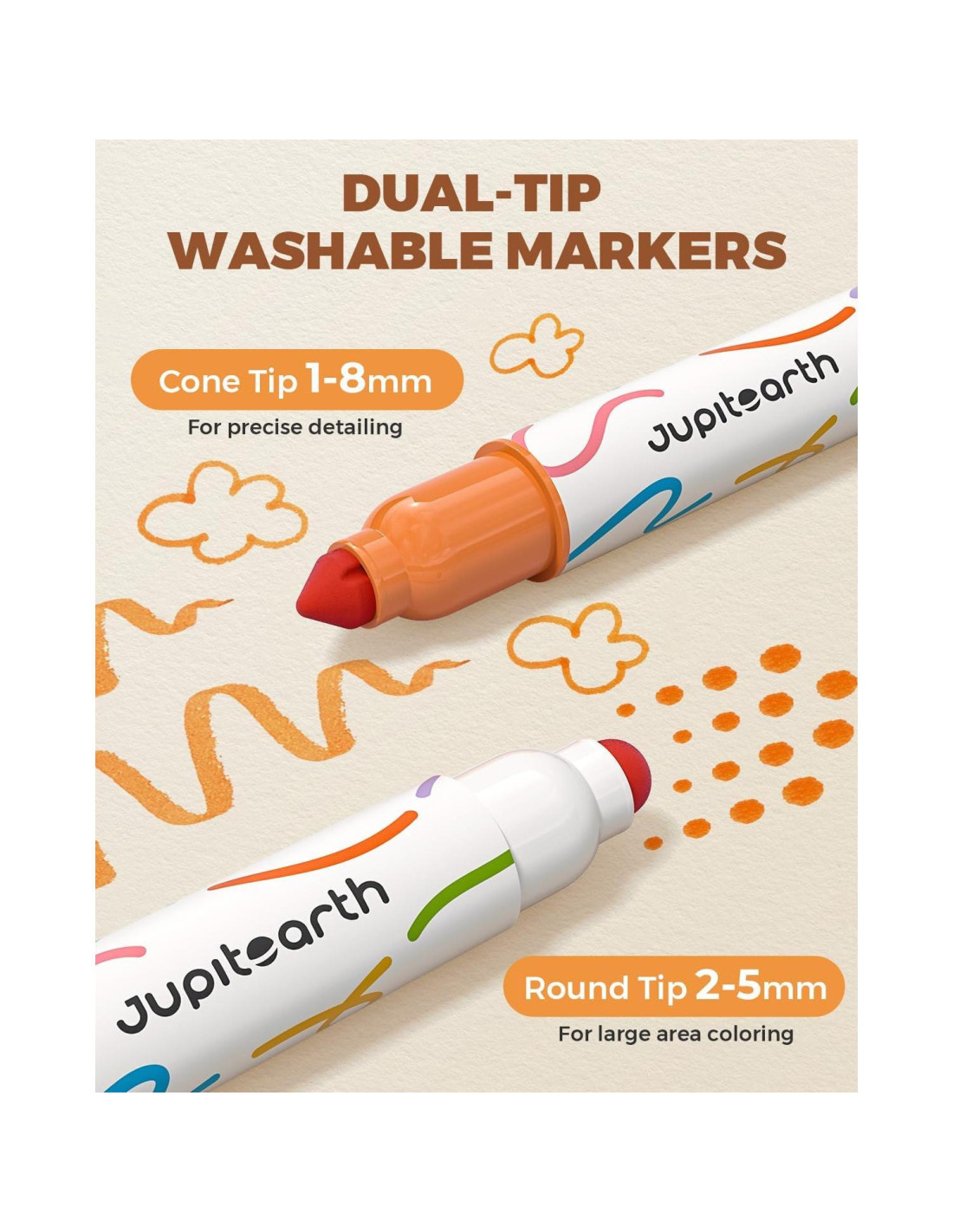 - DIVERSIÓN INFINITA CON PUNTAS DOBLES: Los marcadores para niños de Jupitearth cuentan con una punta redonda para colorear en áreas grandes y una punta ancha para agregar detalles. El diseño del set de marcadores de doble punta permite a los niños explorar su creatividad, desde colorear imágenes hasta hacer pequeños garabatos, convirtiendo cada garabato en una obra maestra.