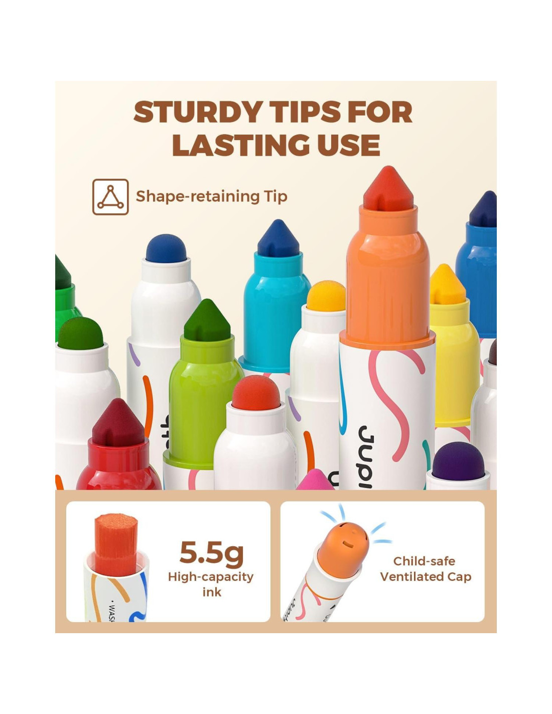 - SEGUROS PARA MANOS PEQUEÑAS: Diseñados para pequeños artistas, nuestros marcadores lavables para niños están diseñados con una forma divertida, linda y gruesa que es fácil de sostener para manos pequeñas. La tinta de grado alimenticio y el barril de plástico del set de colorear para niños aseguran un juego seguro, y la tapa cuenta con orificios de aire para minimizar los riesgos de asfixia. Deje que su hijo coloree con comodidad.
