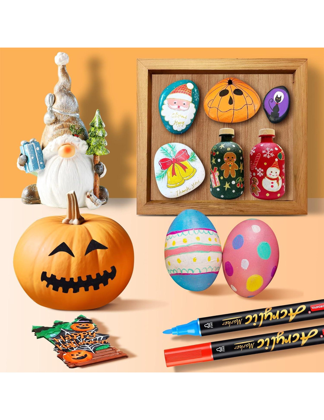 - 20 Colores Vibrantes: Nuestros marcadores de pintura ofrecen una selección de 20 opciones ricas y coloridas, permitiéndote crear obras de arte en varios tonos para satisfacer todas tus necesidades creativas. Como resultado, son adecuados para una variedad de superficies, incluyendo piedra, rocas, cerámica, vidrio, frascos, zapatos de lienzo, telas, mochilas, álbumes de recortes, metales, conchas, madera, huevos, calabazas, plásticos, manualidades navideñas, tarjetas de regalo y otros suministros de manualidades.