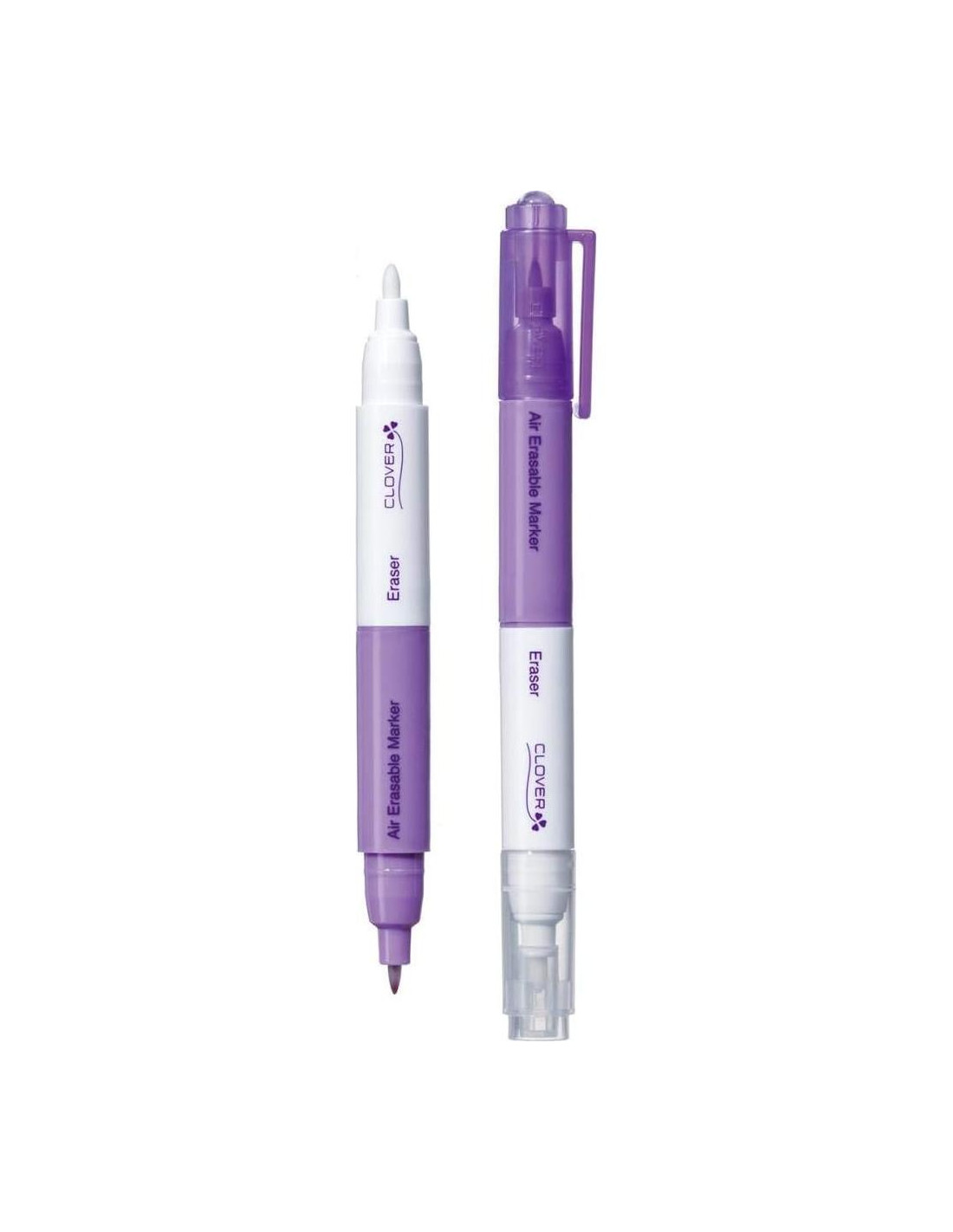 Este Marcador Borrable por Aire Clover No.5032/Punta Fina Púrpura y Borrador es ideal para quienes hacen quilting o cualquier proyecto de costura que requiera marcar para cortar o antes de coser. Las marcas desaparecen naturalmente o con agua. El extremo de borrador es excelente para correcciones rápidas. Este marcador es genial para planificar proyectos de costura. Funciona igualmente bien en telas claras u oscuras. La característica de borrado por aire ofrece tiempo suficiente, de 4 a 14 días para finalizar los detalles. La tapa resistente a rodar mantiene el marcador en su lugar.
