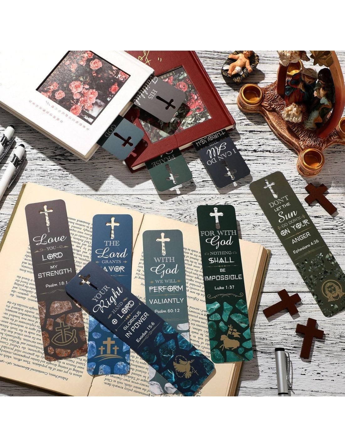 - Diseño Novel: nuestros marcadores religiosos presentan una cruz hueca en la parte superior, versículos bíblicos y elementos clásicos cristianos se combinan con un fondo de mármol oscuro, haciendo que tus libros sean más personalizados, ayudándote a desarrollar fácilmente buenos hábitos de lectura
