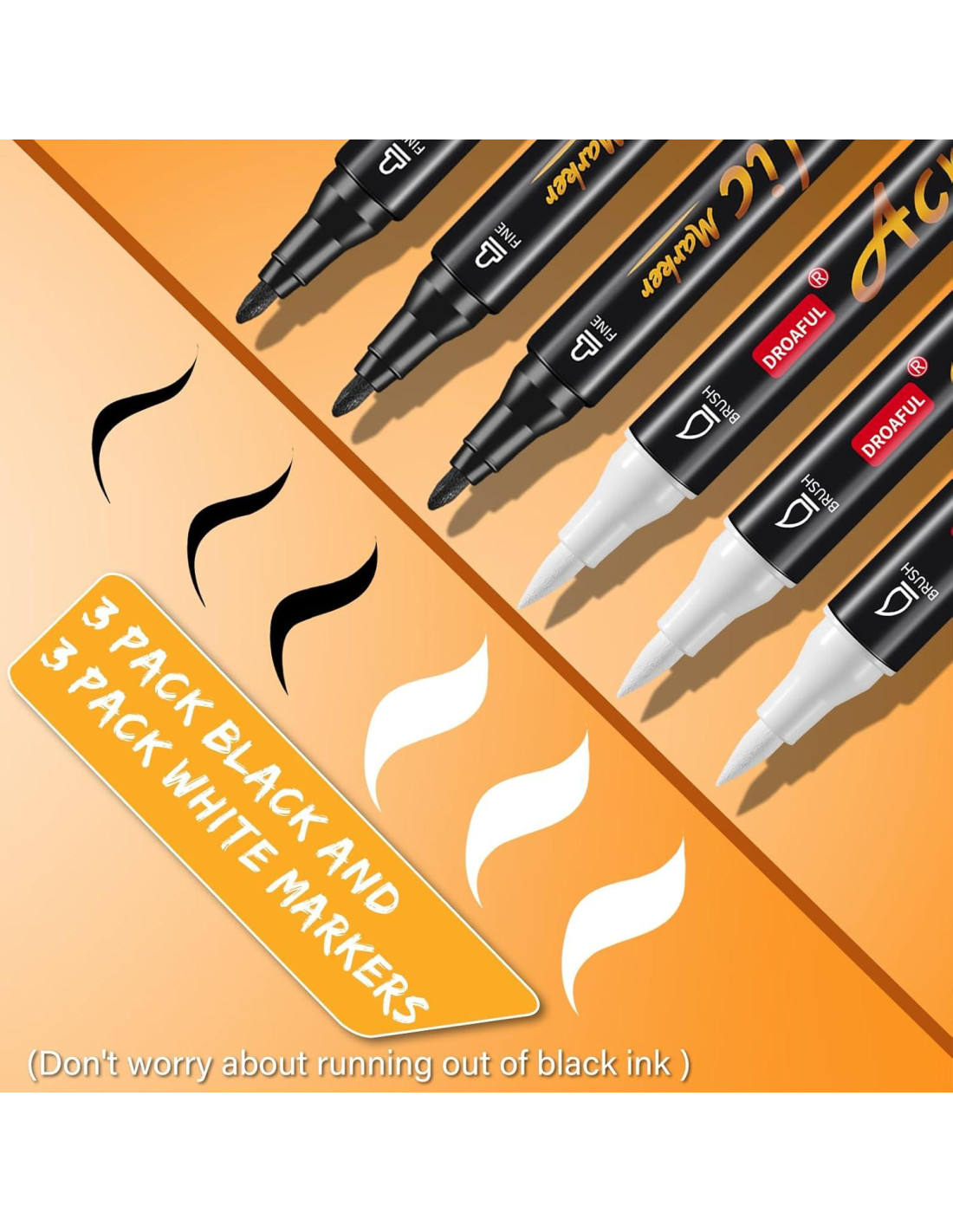 - 6PC Marcadores de Pintura Acrílica Doble Punta Blanca y Negra: Cada marcador de pintura acrílica Droaful viene con una punta de cepillo de 1-5mm y una punta fina de 1mm. La punta fina es perfecta para cualquier creación artística que requiera control preciso, mientras que la punta de cepillo está diseñada para colorear áreas grandes y trabajos detallados. También puedes usarlos para decoraciones de puntos, satisfaciendo todas tus necesidades creativas sin problemas y mejorando la eficiencia y diversión en tu proceso de creación