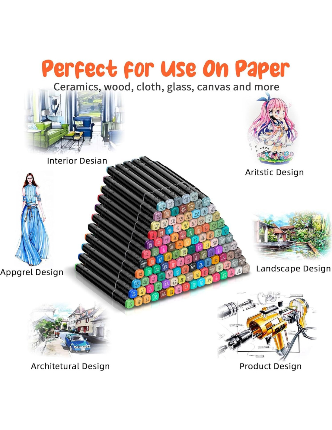 - 120 COLORES + 2 DELINEADORES DE ARTE: Los marcadores de arte de punta dual contienen 120 marcadores de colores vibrantes que resisten la decoloración con el tiempo, incluye 2 bolígrafos delineadores de arte, 1 carta en blanco para hacer una tarjeta de muestra y 1 estuche de almacenamiento.