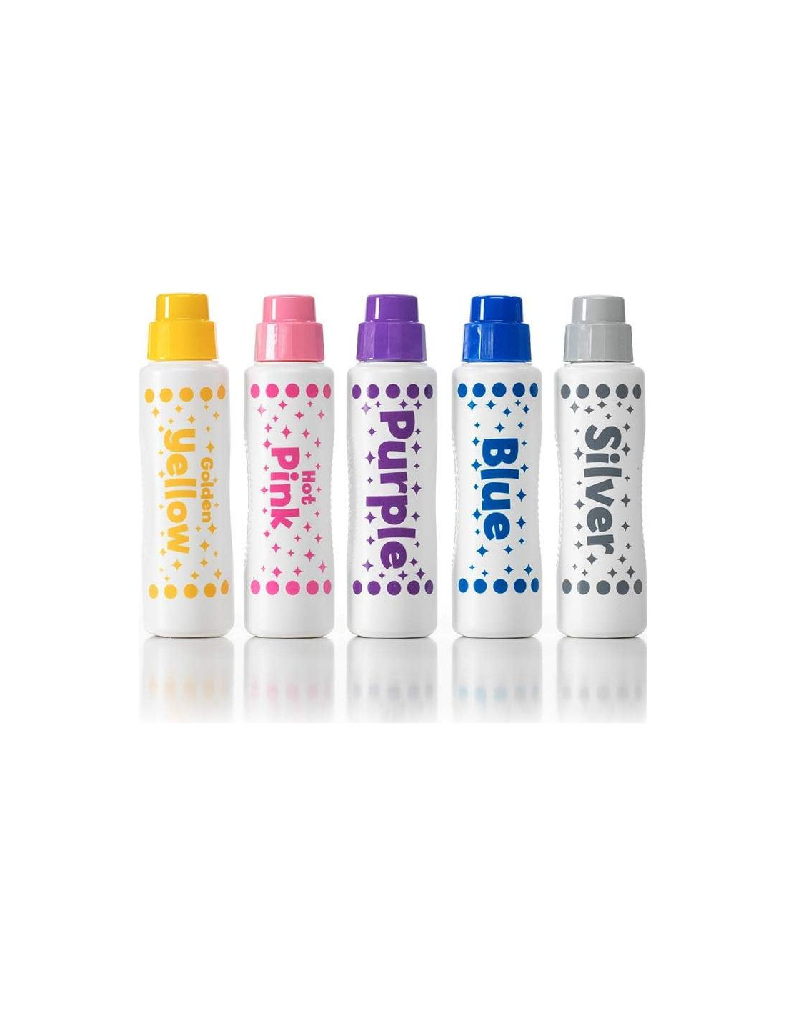 - SIN TAZAS, SIN BROCHA, SIN DESORDEN: Los marcadores de puntos lavables son fáciles de preparar y limpiar. Viene con 5 colores Brillantes no tóxicos en botellas que no derraman ni salpican. Morado, Amarillo, Rosa, Azul y Plata.