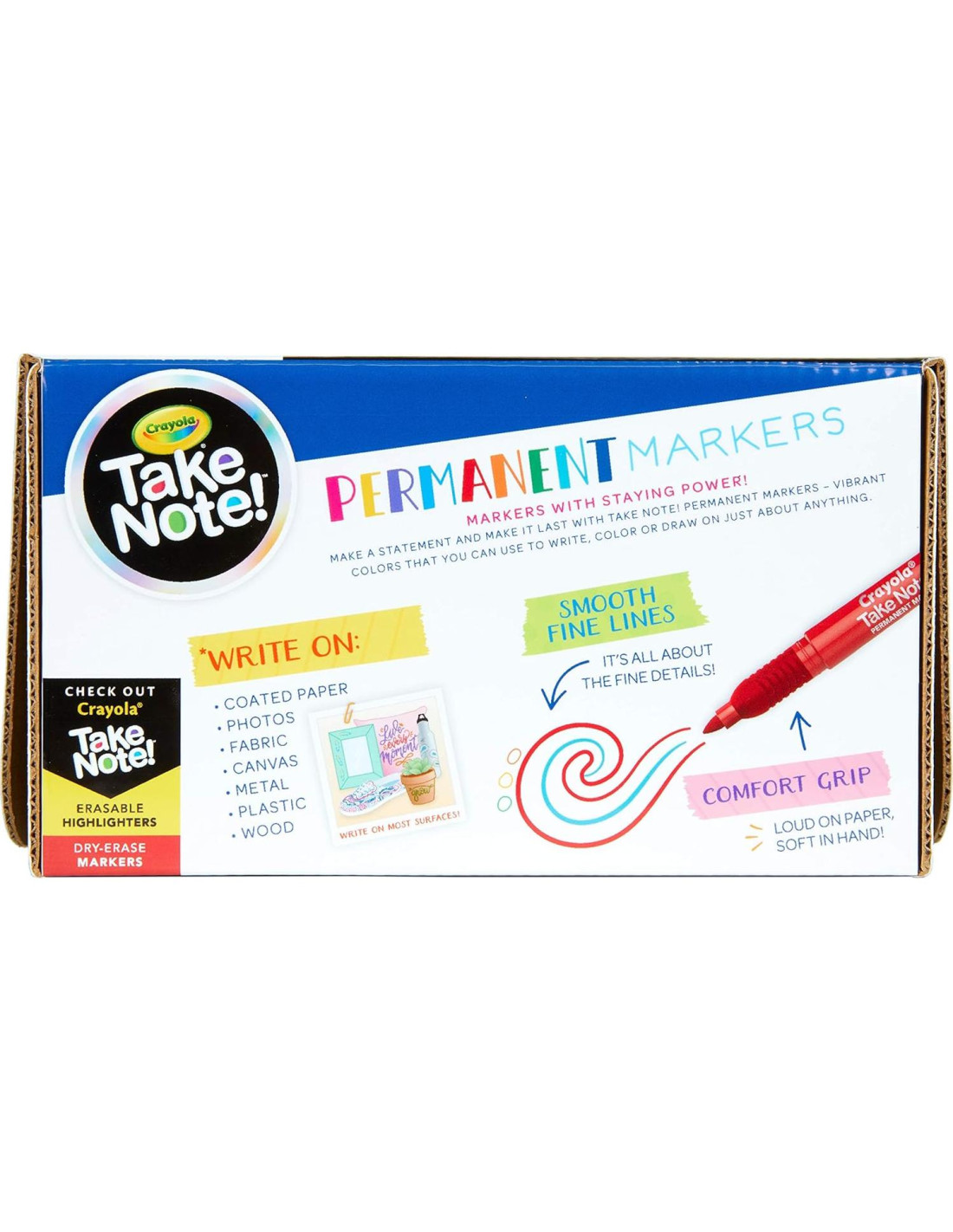 - Colores Crayola: Cada marcador permanente Take note tiene su propio nombre de color listado en el barril. Los colores destacados incluyen 20 de little black dress, 12 de Invincible, 12 de beet goes on, 12 de bravocado, 12 de india-go y 12 de wild & free.