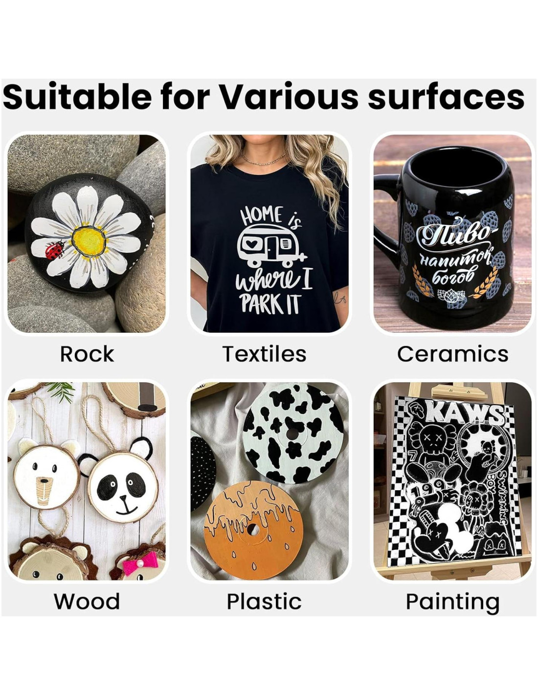 - Adecuado para Superficies Diversas: Los marcadores Tesquio pueden funcionar bien en una variedad de superficies. Como cartón de piedra, tela, madera, cerámica, plástico, vidrio, metal, etc. La tinta premium tiene un fuerte poder de cobertura que mantendrá tu trabajo fresco por mucho tiempo