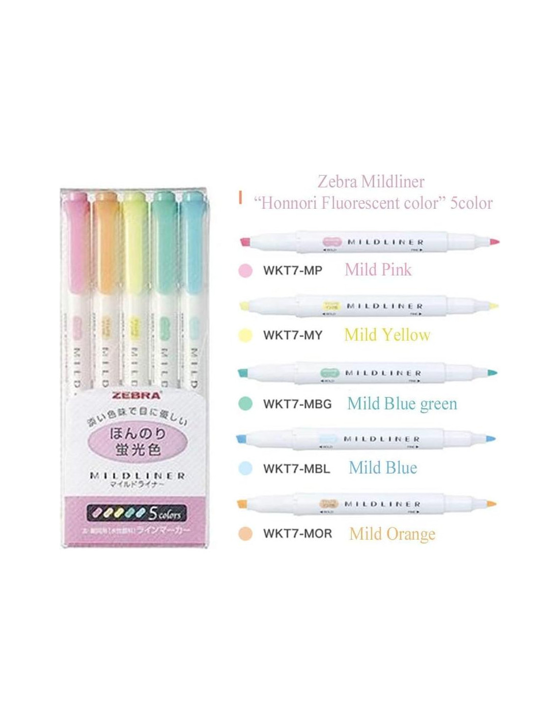- Rango completo de 5 conjuntos diferentes de marcadores mildliner pastel de Zebra (el conjunto WKT7-N-5C es el último conjunto de colores, colores suaves y sutiles)