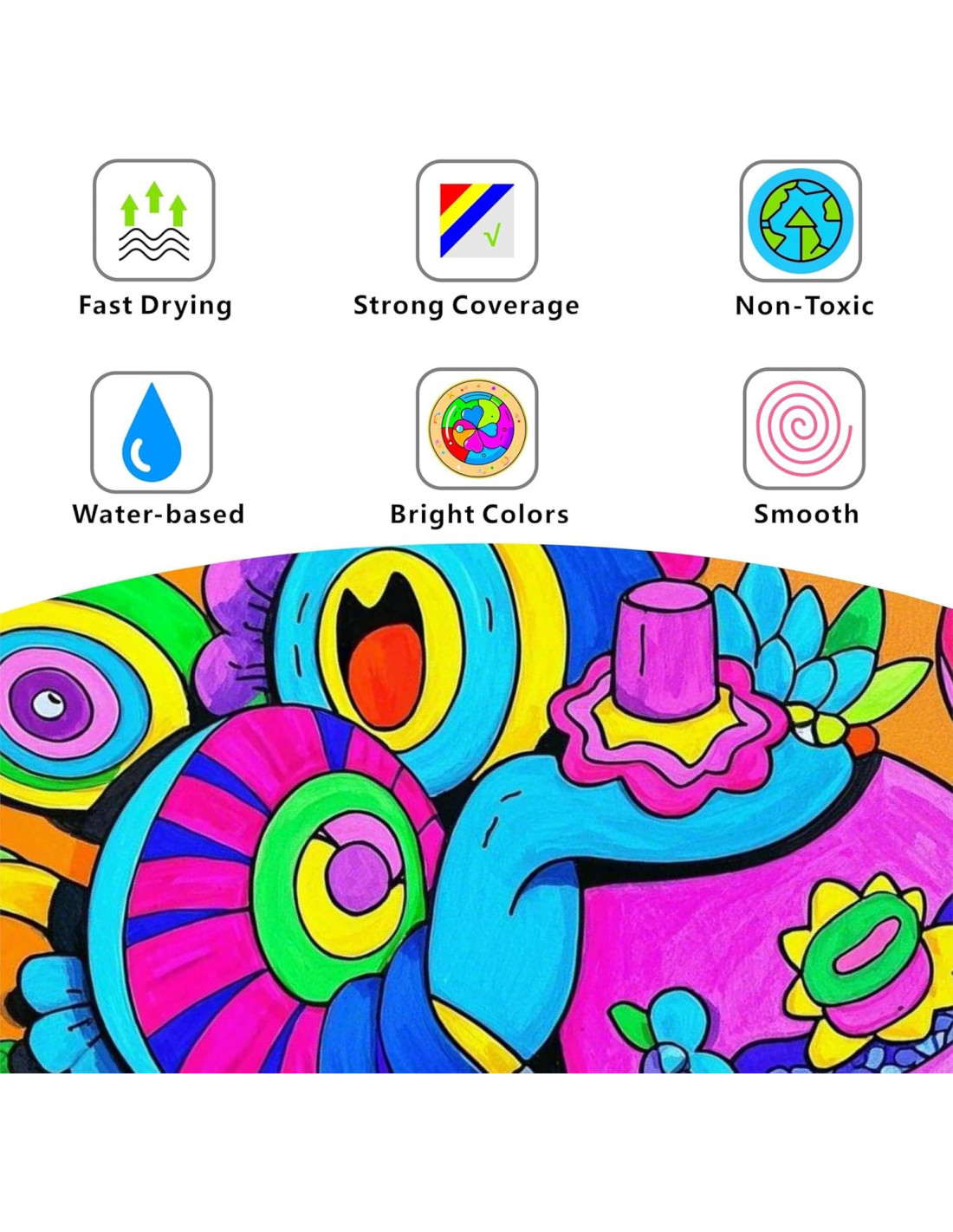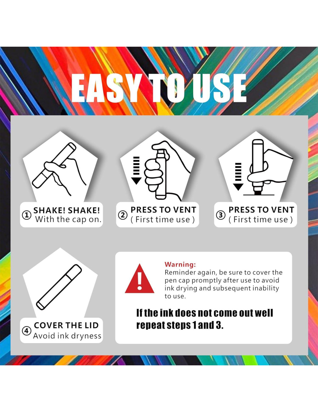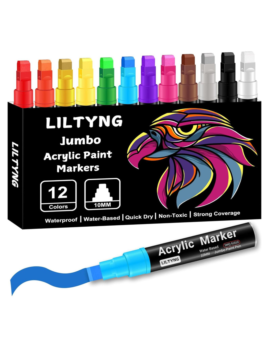 - Marcadores de Póster Jumbo: El marcador de pintura acrílica es tinta acrílica a base de agua. Las características del pigmento acrílico son no tóxicas, libres de ácido, inodoras, con gran cobertura, de secado rápido, impermeables y de flujo suave.