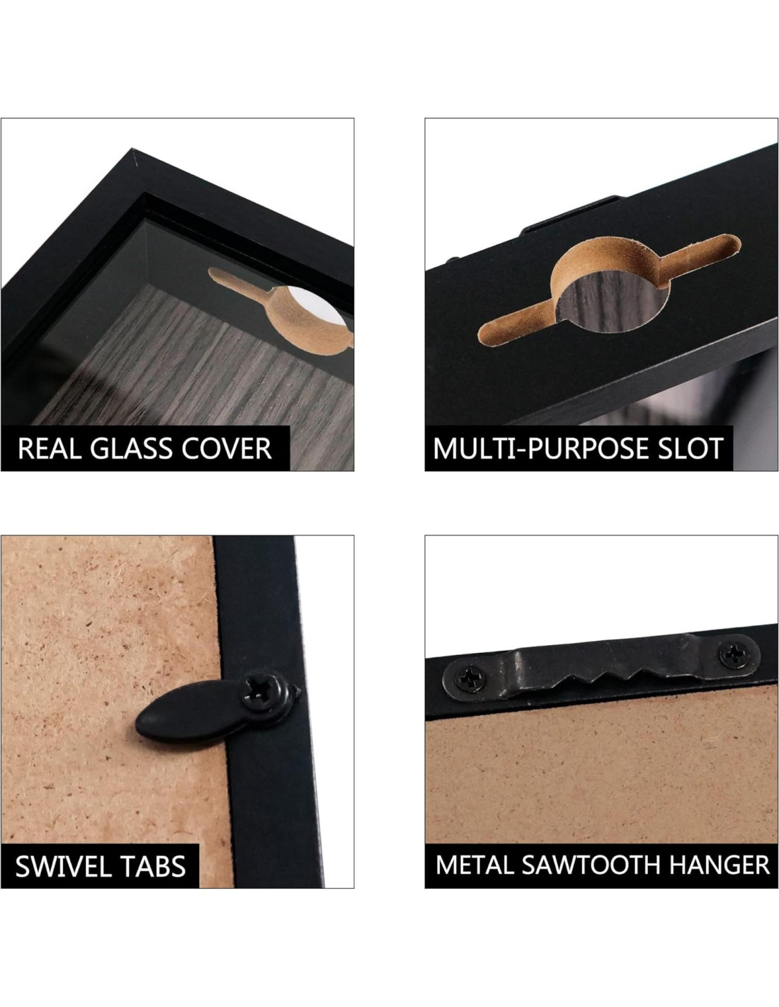 - Funcional: Las pestañas giratorias en la parte posterior facilitan la apertura. Con un colgador de sierra, esta caja se puede colgar en la pared para exhibición. También se puede colocar simplemente sobre una mesa, escritorio o encimera por sí sola.