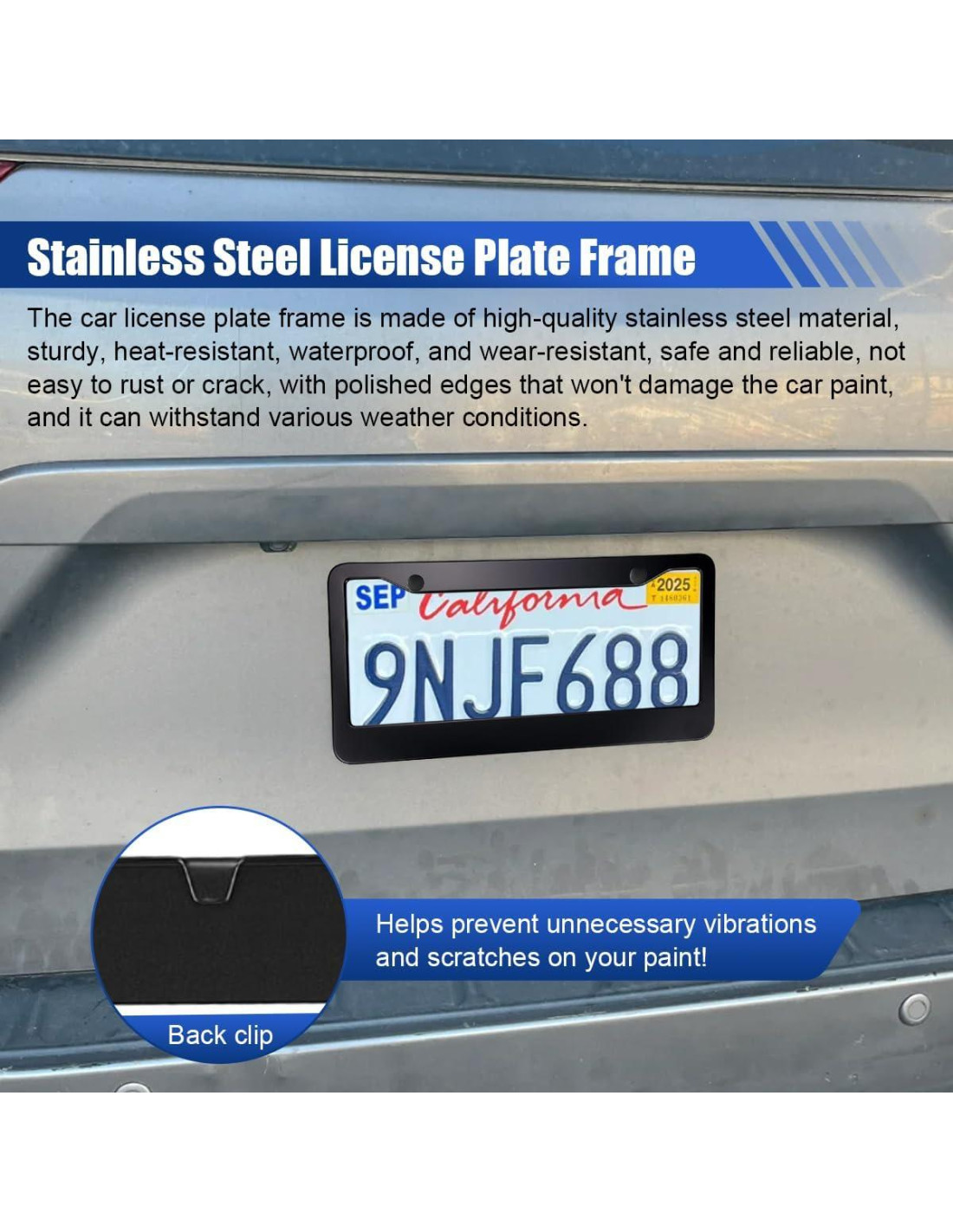 - [Material Confiable] : Este soporte de placa de licencia de coche está hecho de acero inoxidable de alta calidad, que es fuerte, resistente al desgaste, a la corrosión, impermeable y resistente a altas temperaturas, y puede adaptarse a varios entornos complejos. Los bordes están finamente pulidos, son suaves y redondeados, y no dañarán la pintura del coche durante la instalación.