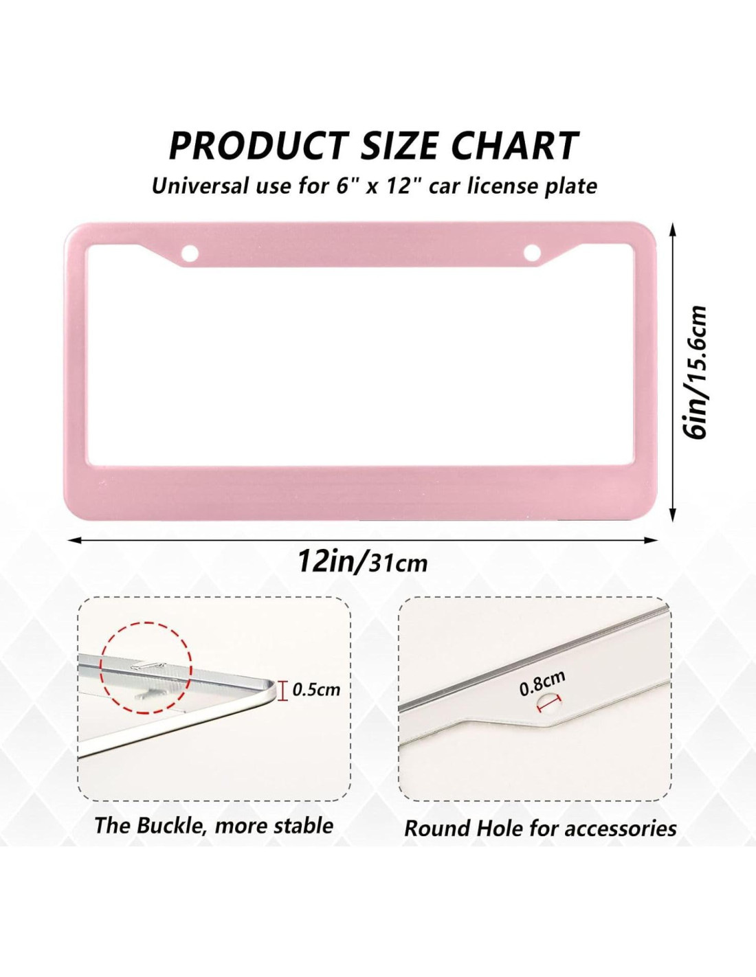 - Universal - Juego de 2 piezas de marco de placa de licencia delantero y trasero. El tamaño del marco de la placa de licencia es 6" x 12" (15.2 cm x 30.5 cm), tamaño estándar de placa de licencia para el marco de placa de licencia delantera y trasera.