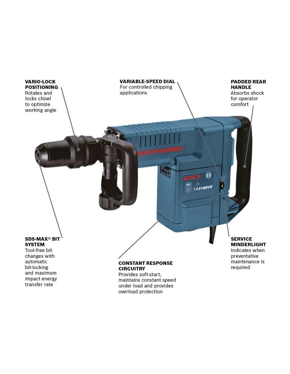 - Potencia: Con un motor de 14.0 Amperios y circuitería de Respuesta Constante para arranque suave, velocidad constante bajo carga y protección contra sobrecarga. El Bosch 11316EVS proporciona 12.4 Ft. Lbs. de energía de impacto y golpes por minuto sin carga de 900 a 1,890
