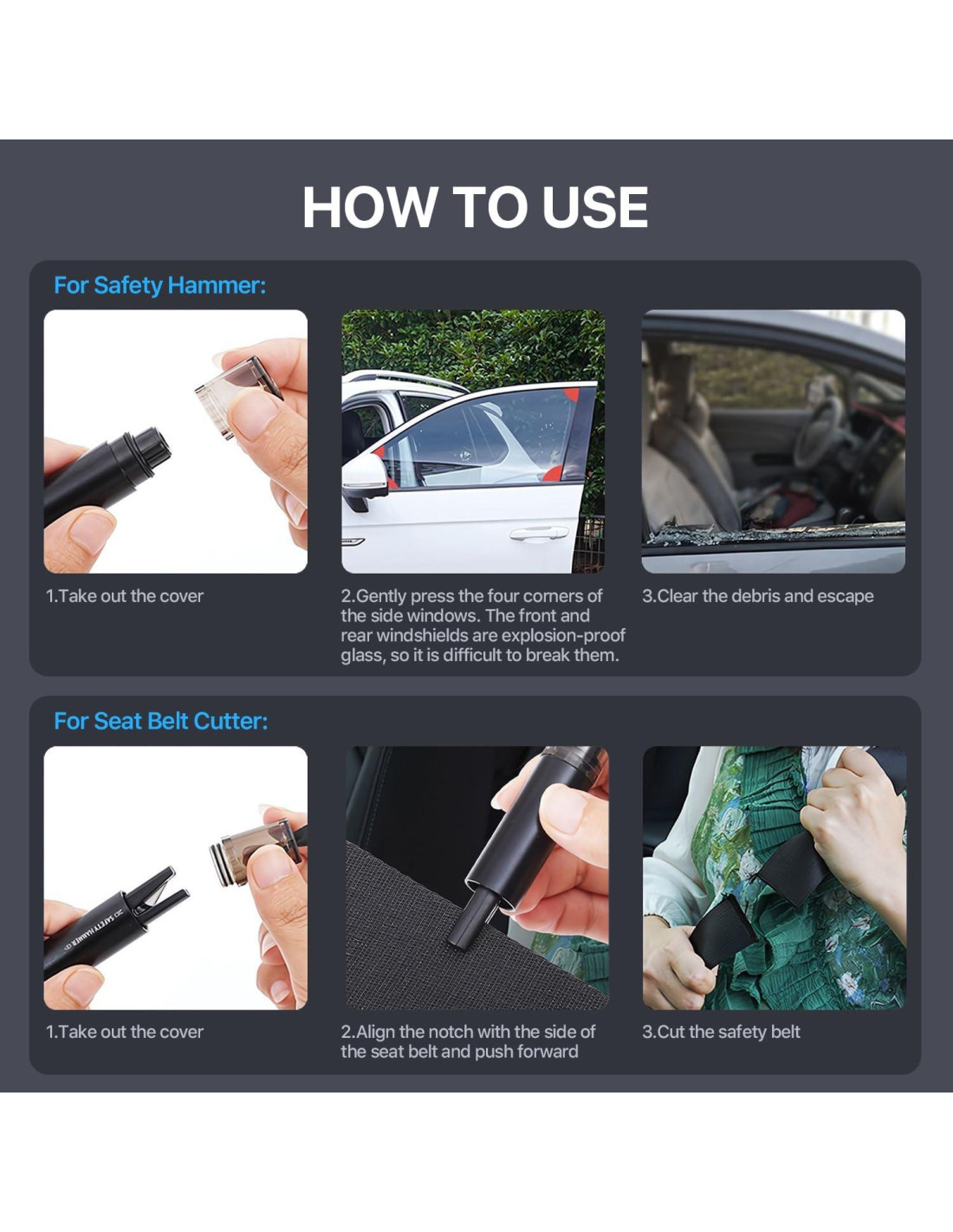 - Utilidad de Emergencia Versátil - Ya sea un vuelco, incendio en el auto o incluso inundaciones, nuestra herramienta de seguridad de emergencia puede ayudarle a escapar de cualquier situación y está diseñada para resistir la interferencia de presión de agua para emergencias bajo el agua.