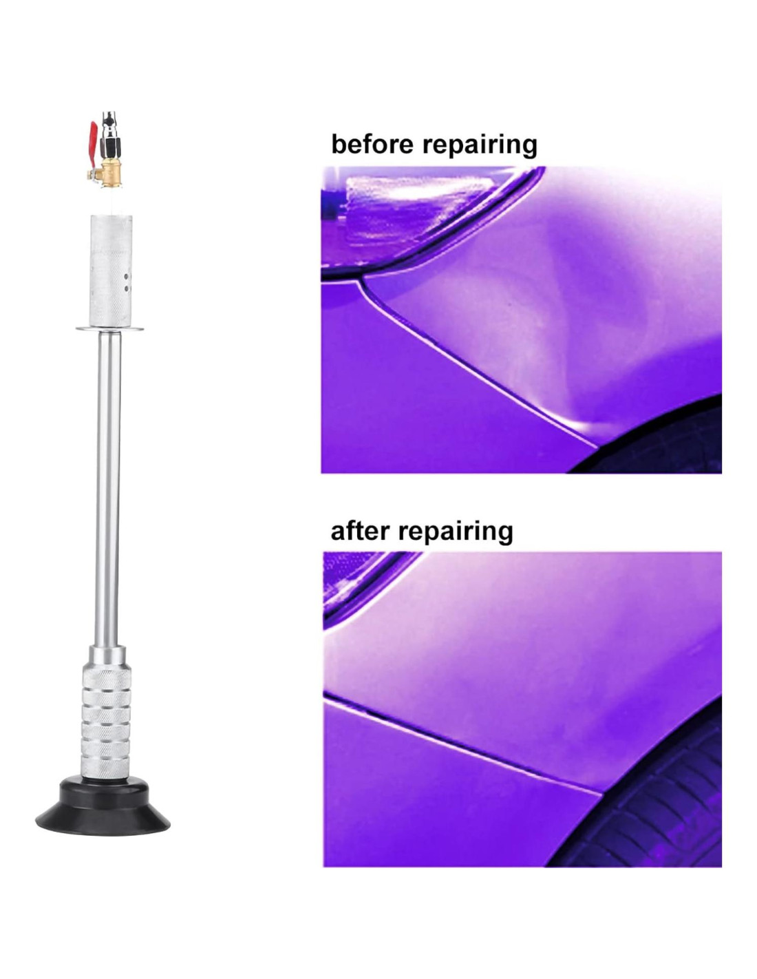 - MARTILLO DESLIZANTE INCORPORADO: Olvídate de procesos de reparación complicados. Con el martillo deslizante incorporado de nuestro extractor de abolladuras, la eliminación de abolladuras se simplifica. Simplemente coloca la ventosa sobre la abolladura y deja que el martillo deslizante haga su magia