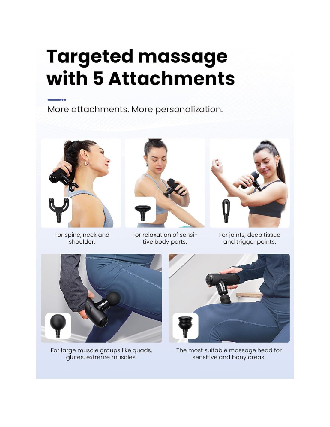 - Masaje de Tejido Profundo y Poderoso Alivio del Dolor: La Q2 Mini cuenta con 5 velocidades ajustables (1800, 2100, 2400, 2700, 3000 RPM) y una amplitud de 7 mm, proporcionando terapia de tejido profundo para deshacer nudos, relajar músculos tensos y ofrecer un alivio efectivo del dolor. Cada velocidad ofrece beneficios terapéuticos adaptados para diferentes grupos musculares. Con 5 cabezales de masaje intercambiables, apunta con precisión a áreas de difícil acceso, asegurando una experiencia de masaje personalizada para el alivio del dolor y la recuperación.