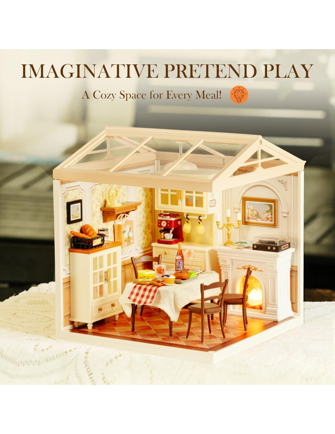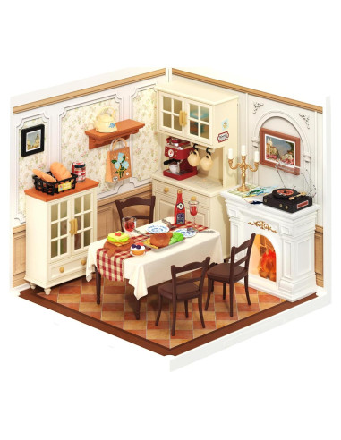 - [ROBOTIME Super Creator Series] - Este kit de comedor irradia una atmósfera acogedora y hogareña con muebles intrincados. Es perfecto para combinar con otros kits de temática hogareña para construir tu casa miniatura personalizada.