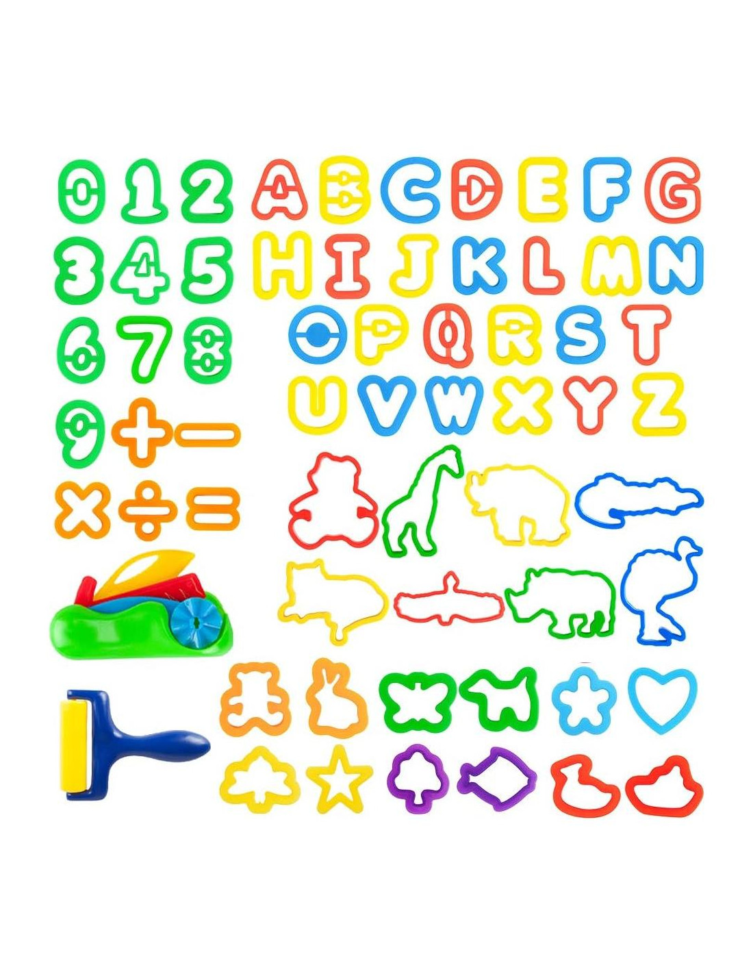 - Componentes incluidos: Rodillos y Cortadores, Moldes de Animales, Moldes de Letras, Moldes de Números