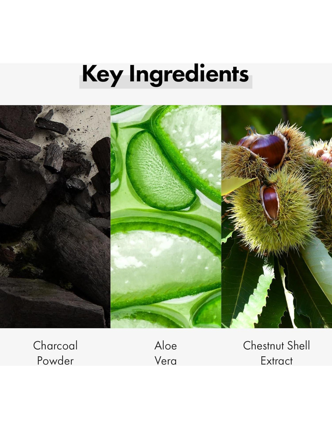 Los ingredientes principales de este producto de cuidado de la piel coreano son polvo de carbón para limpieza profunda de poros y exfoliación de la piel, extracto de aloe vera para hidratación profunda y nutrición de la piel, y extracto de cáscara de castaña para hidratación y reducción de poros.