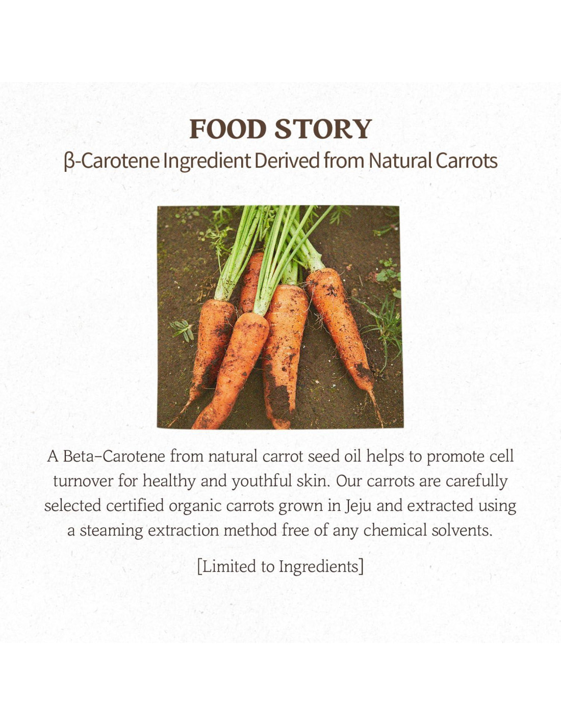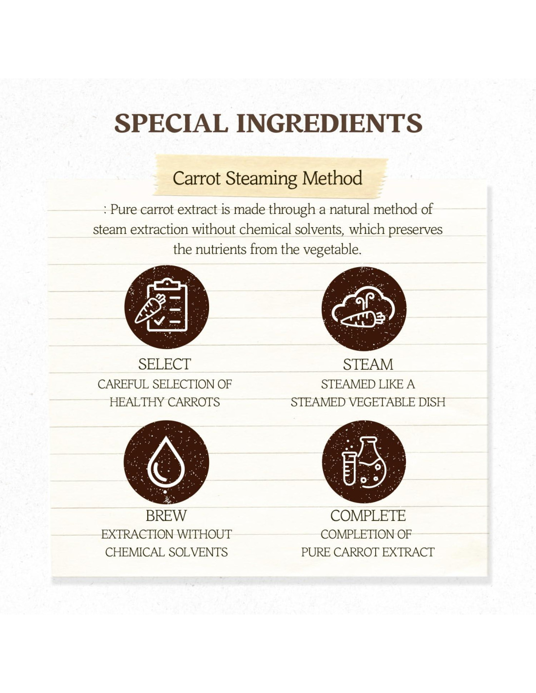 - Beta-caroteno derivado de aceites de semilla de Daucus Carota Sativa (Zanahoria) están incluidos. Contiene zanahorias crudas, no pesticidas, cultivadas en la Isla Jeju, y completó el método de vapor de zanahoria pura para obtener extracto puro de raíz de Daucus Carota Sativa (Zanahoria).