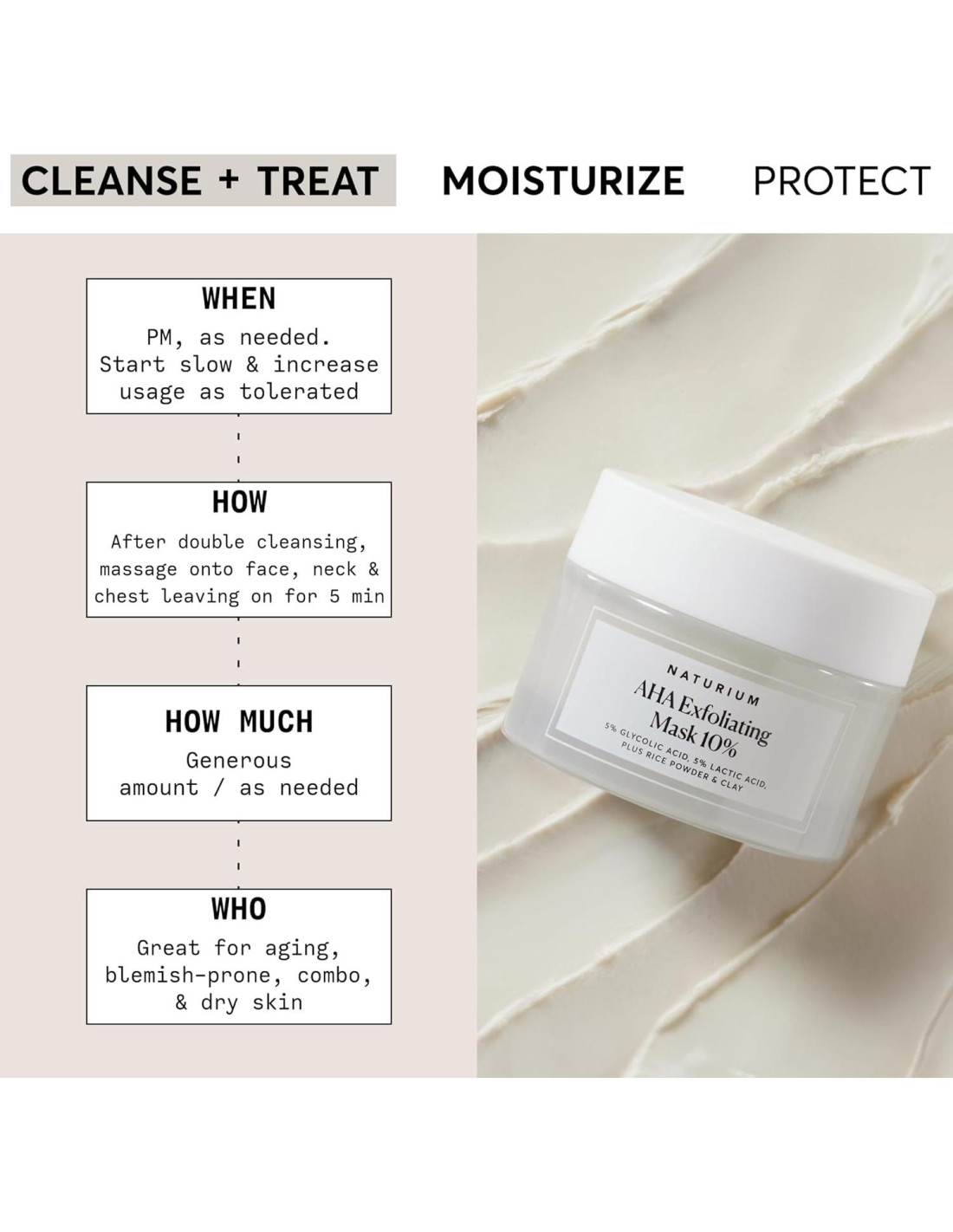 Nuestra mascarilla exfoliante AHA 10% está formulada con ácidos glicólico y láctico para ayudar a renovar la piel, mejorando la apariencia de la textura de la piel. Lo que hace Exfoliación de acción dual que renueva y ilumina instantáneamente la piel Minimiza la apariencia de los poros Mejora la textura, dejando la piel suave y radiante NIVEL DE PH: Nivel de pH de la fórmula: 3.5 - 4 Nuestra misión es crear un cuidado de la piel clínicamente efectivo y asequible, formulado con ingredientes naturales potentes y avanzados ingredientes sintéticos. Los productos de Naturium utilizan niveles eficaces de ingredientes activos, son apropiados para el nivel de pH y se prueban exhaustivamente para garantizar su seguridad. Se recomienda realizar una prueba de parche para todos los productos antes de su uso.