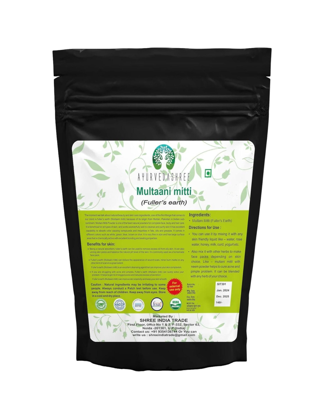 - El polvo de Tierra de Fuller AYURVEDASHREE se obtiene de Rajasthan, India. Está tamizado tres veces, es ultra fino, no irradiado y sin ningún tipo de adulteración. Sin conservantes. Sin agentes blanqueadores. Sin parabenos. Sin fragancia externa irritante.