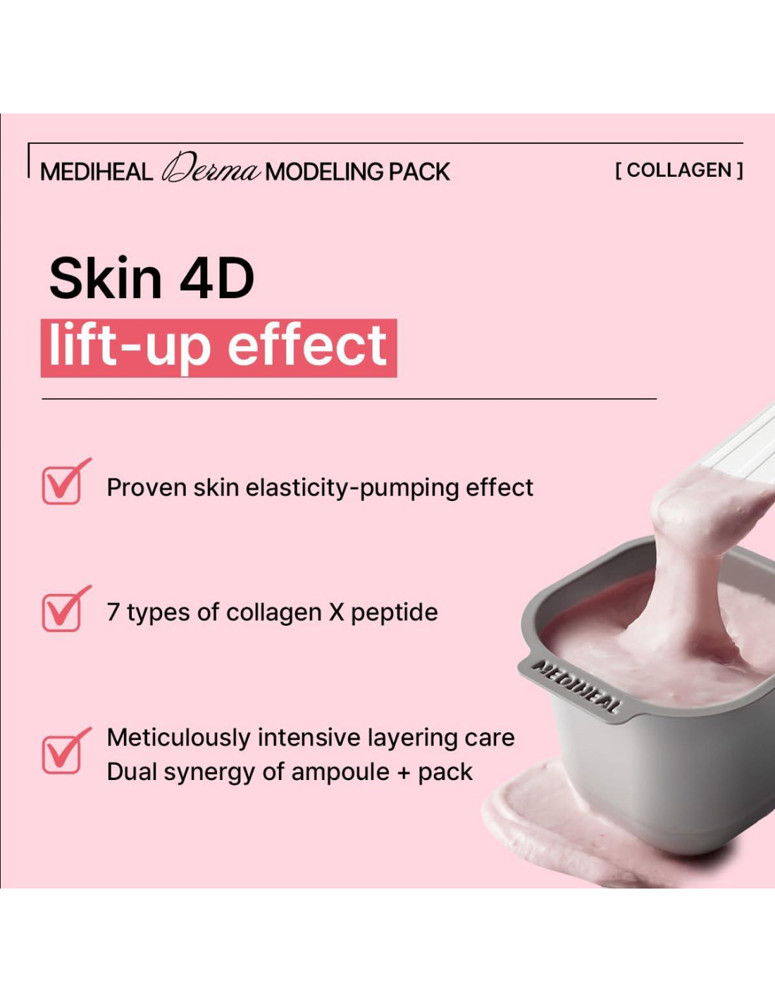 - Cómo usar: Aplica el ampoule, mezcla el paquete de modelado con agua fría, aplica rápidamente y después de 15 minutos, retira para suavizar la textura de la piel.