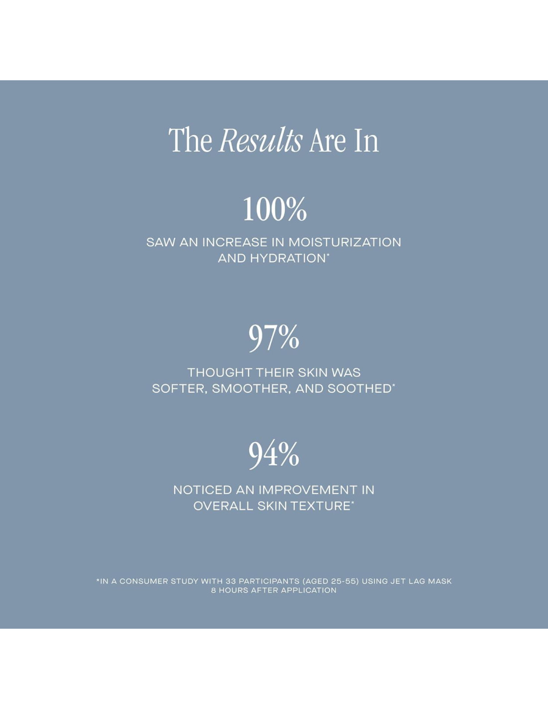 - Los Resultados Están Aquí - En un estudio de consumidores con 33 participantes de 25 a 55 años, el 100% de los participantes vio un aumento en la hidratación y humectación 8 horas después de la aplicación de la Máscara Jet Lag.*