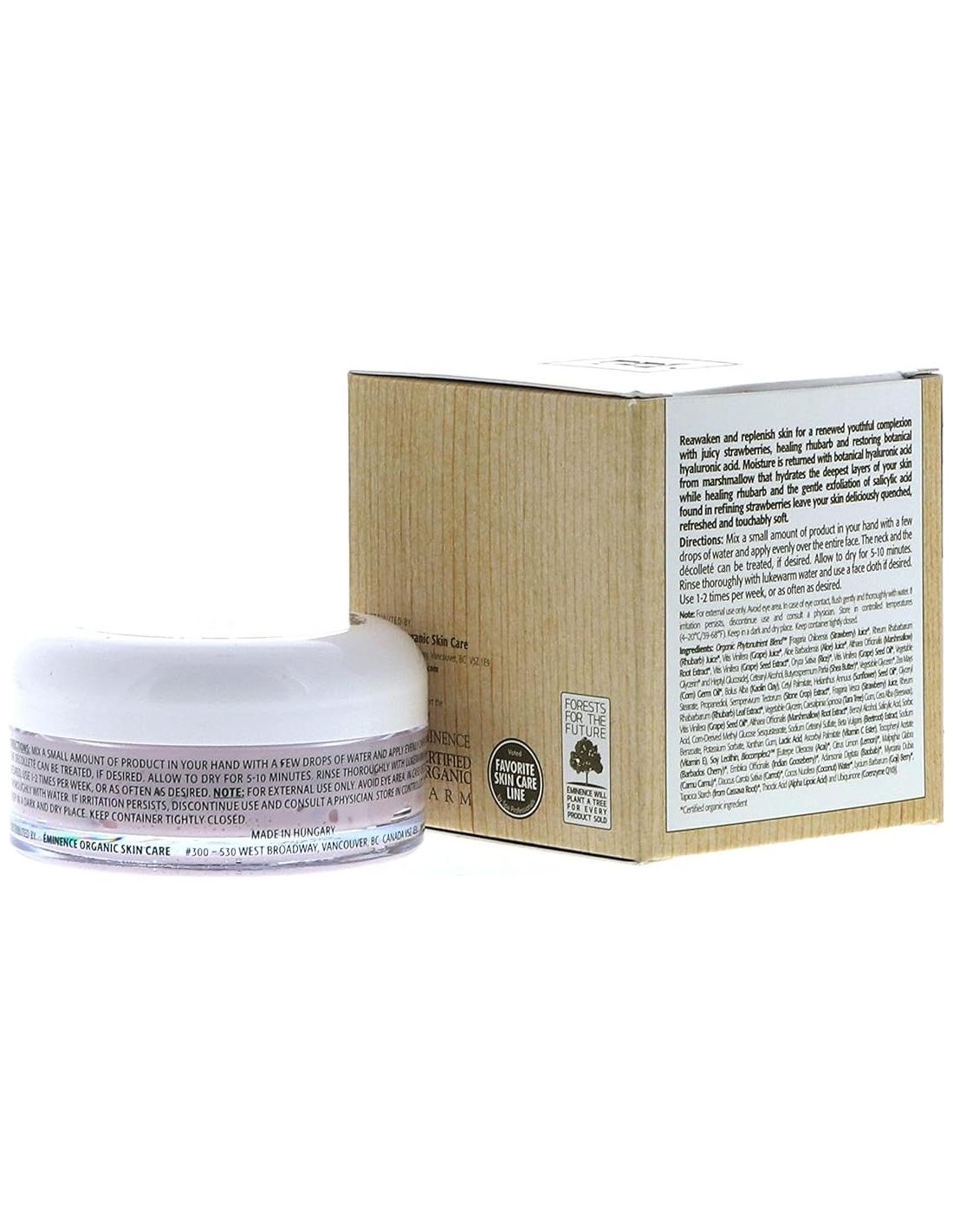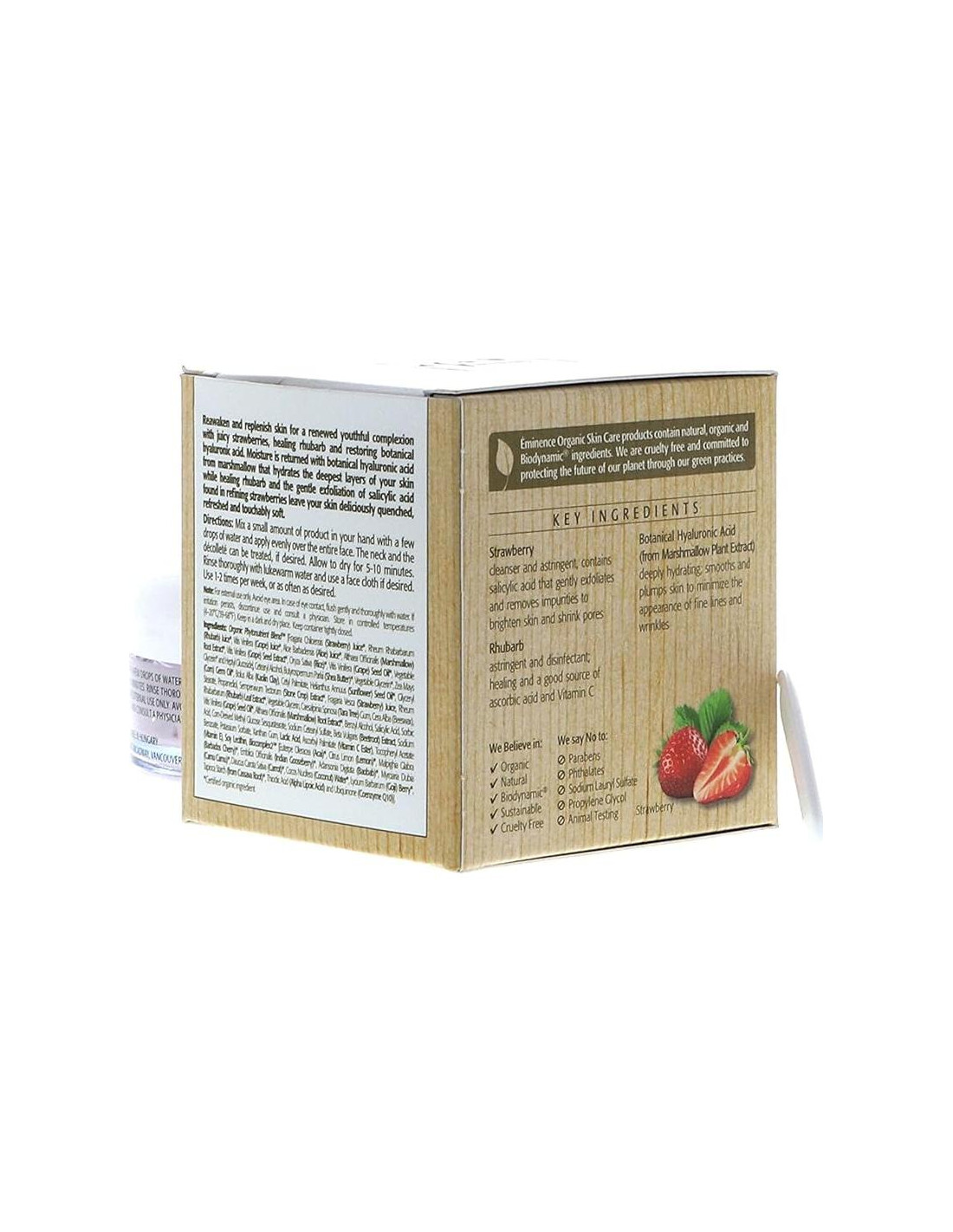 Esta mascarilla hidrata intensamente, calma y llena la piel con ingredientes orgánicos complejos. El Ácido Hialurónico natural mantiene la humedad de la piel y la rellena, ya que tiene la capacidad de retener hasta 1000 veces su peso en agua. La Mascarilla de Fresa y Ruibarbo de Eminence contiene fresa, que añade luminosidad a la piel y alivia la inflamación, y ruibarbo, que es un desinfectante terapéutico. Esta combinación ofrece un excelente tratamiento para la piel que ha sido estresada por factores ambientales como las quemaduras solares.