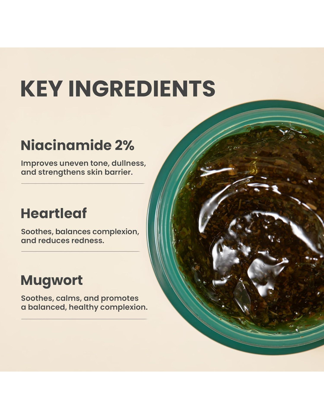 - Cuidado Nutritivo: Impulsada por Hoja de Corazón y Artemisa, nuestra máscara refrescante calma el enrojecimiento, reduce la sequedad y ayuda a minimizar la apariencia de los poros para una piel equilibrada y con un aspecto saludable.