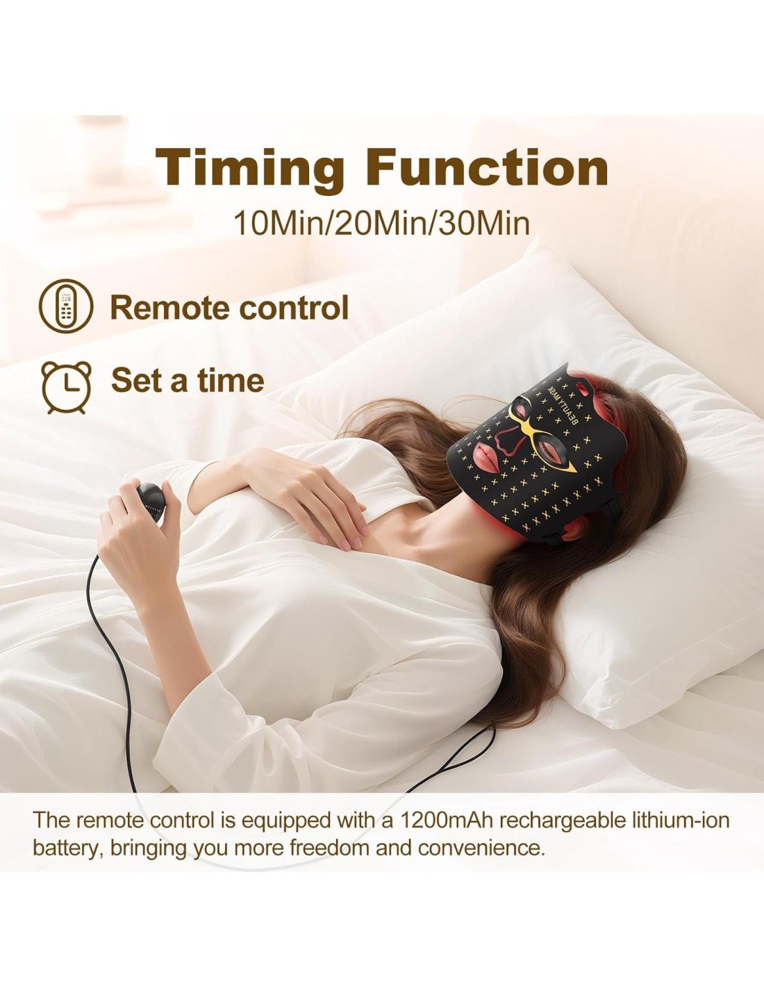 - Máscara de Cara LED con Control Remoto Inteligente Recargable: Controla fácilmente la máscara de luz roja con el control remoto recargable de 1200mAh. 3 niveles de energía (E1-E3) y 3 temporizadores (10/20/30 minutos). El dispositivo se apagará automáticamente cuando termine el temporizador. Nota: El controlador debe estar completamente cargado antes de usar. No use el dispositivo durante la carga.