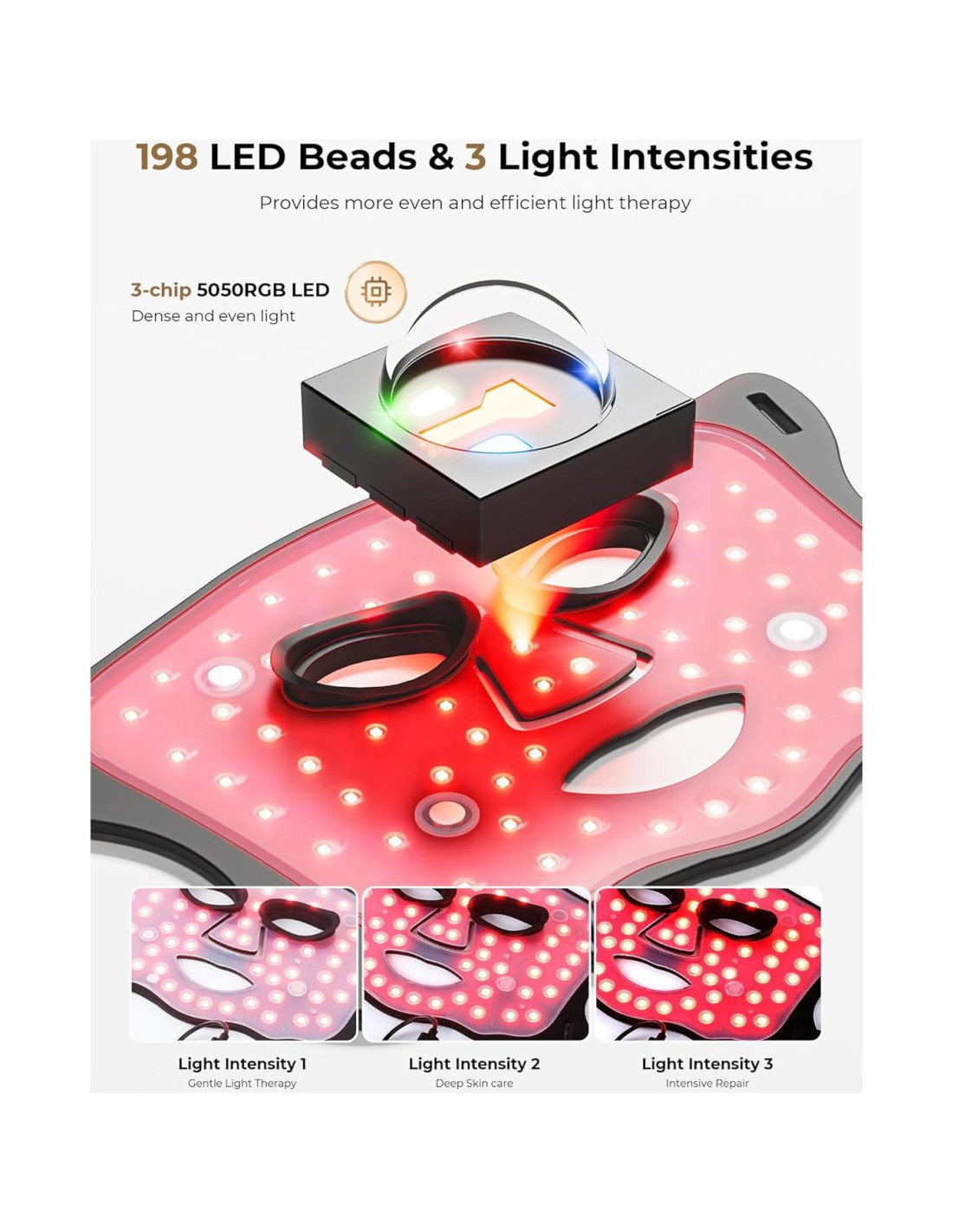 - Chip Avanzado 3-en-1 y 198 Perlas LED: La terapia de luz roja para la máscara facial está impulsada por un chip avanzado 3-en-1 que alimenta 198 perlas LED de alta calidad, aumentando el efecto de agregación de las ondas de luz por 3 veces, resultando en una irradiación más uniforme, densa, completa y efectiva. Esto asegura que la máxima energía de luz se entregue a tu piel para resultados superiores y visibles más rápidos en 4 semanas.
