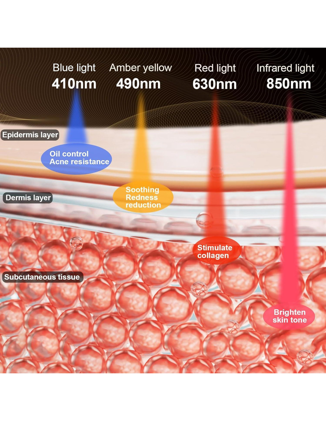 - 3 Modos de Terapia de Luz Roja para la Cara: luz roja (630nm) + luz infrarroja cercana (850nm), luz azul (410nm) y luz amarilla (490nm) 3 modos de luz. La combinación de luz roja y luz infrarroja cercana es la mejor combinación para aumentar la elasticidad y el brillo de la piel. La luz azul puede ayudar a equilibrar la secreción de aceite. La luz amarilla ayuda a mejorar el enrojecimiento de la piel. La máscara de luz roja tiene 3 niveles de brillo, presione brevemente la tecla de encendido para ajustar el brillo.