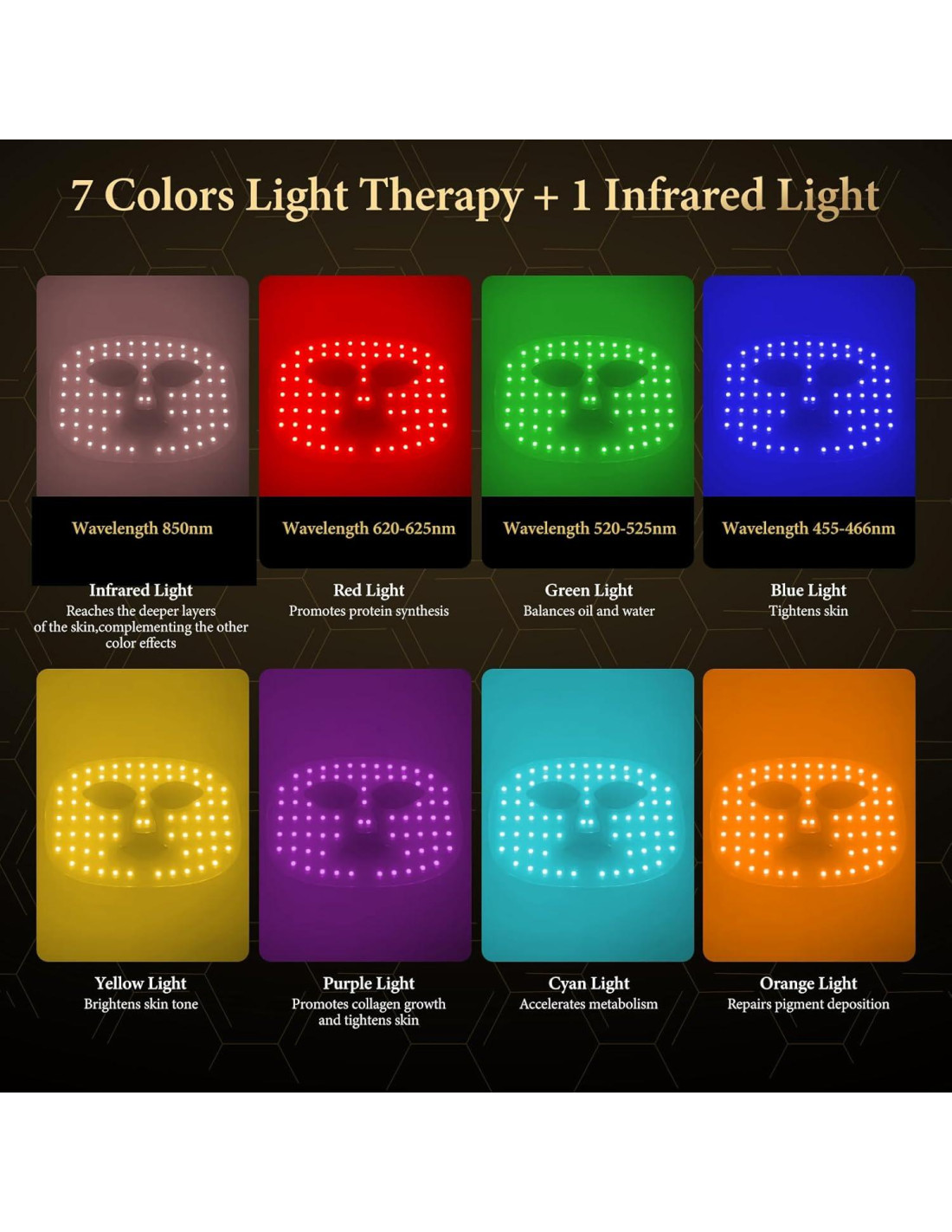 - TERAPIA DE LUZ INFRARROJA CERCANA DE 850nm: Luz infrarroja invisible que penetra la superficie de la piel hasta las capas más profundas. Con 7 terapias de luz colorida con diferentes longitudes de onda, la terapia de luz roja para la cara puede penetrar y reparar diferentes problemas de piel