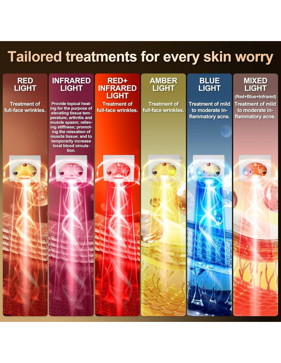- Uso previsto:- Luz roja: Tratamiento de arrugas en toda la cara. - Luz infrarroja: Proporciona calentamiento tópico con el propósito de elevar la temperatura del tejido; artritis y espasmos musculares; aliviando la rigidez; promoviendo la relajación del tejido muscular; y para aumentar temporalmente la circulación sanguínea local.- Luz Roja+Infrarroja: Tratamiento de arrugas en toda la cara. - Luz ámbar: Tratamiento de arrugas en toda la cara.- Luz azul: Tratamiento de acné inflamatorio leve a moderado.- Luz mixta(Roja+Azul+Infrarroja): Tratamiento de acné inflamatorio leve a moderado.