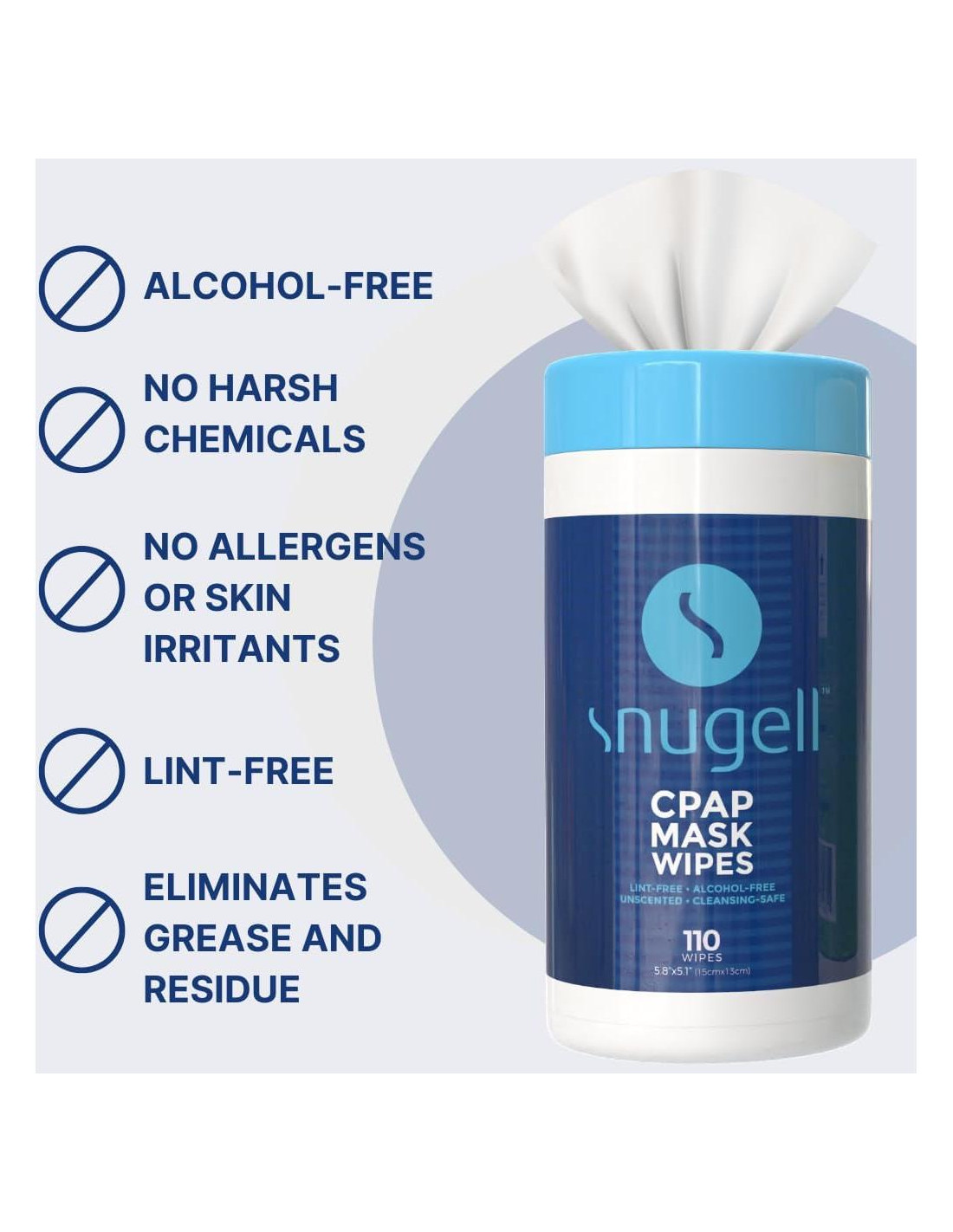 Bienvenido a Snugell - Su fuente confiable para accesorios CPAP de alta calidad. Entendemos la importancia de una buena noche de sueño y el impacto que puede tener en su salud y bienestar general. En Snugell, estamos comprometidos a proporcionarle los mejores accesorios CPAP, asegurando una experiencia de terapia CPAP cómoda y efectiva. Snugell está a su lado en su camino hacia un mejor sueño. A medida que millones en todo el mundo dependen de la terapia CPAP para la apnea del sueño, entendemos la importancia de un buen descanso nocturno. Nuestros accesorios CPAP de alta calidad están diseñados para garantizar una experiencia de terapia cómoda y efectiva. Mejore su experiencia CPAP con nuestros accesorios CPAP premium. Priorizamos la comodidad y el ajuste en nuestro catálogo de productos integral. Nuestra misión es tener un impacto positivo en la vida de nuestros clientes, ayudándoles a lograr un sueño reparador y gestionar eficazmente la apnea del sueño. Las toallitas para máscaras CPAP Snugell son Sin Fragancia y Sin Alcohol, diseñadas para ser utilizadas de manera segura para la limpieza diaria sin el riesgo de que sustancias químicas dañinas entren en su máscara o tubo. Su componente de aloe vera protege su piel y equipo. Toallitas de alta absorción y sin pelusa dejan su CPAP reluciente, sin riesgo de daño. Las toallitas premium de Snugell limpian rápidamente su máscara, tubo y dispositivos - directamente desde su cama. 110ct. 70ct. 150ct. 40ct. Paquetes de Viaje. ¿Puedo usar estas toallitas en todas las partes de mi equipo CPAP? ¡Sí! Las toallitas Snugell son seguras para limpiar su máscara CPAP, tubo y humidificador. ¡Solo evite usarlas en componentes eléctricos o filtros! ¿Por qué elegir las toallitas Snugell sobre otros métodos de limpieza? Las toallitas Snugell ofrecen una forma conveniente y suave de limpiar su equipo CPAP en comparación con el lavado y enjuague diario. Son sin fragancia, sin alcohol e infusionadas con aloe vera, lo que las hace seguras para su piel y equipo. ¿Cuántas toallitas hay en cada envase? Con 110 toallitas por envase, tendrá mucho poder de limpieza durante mucho tiempo.