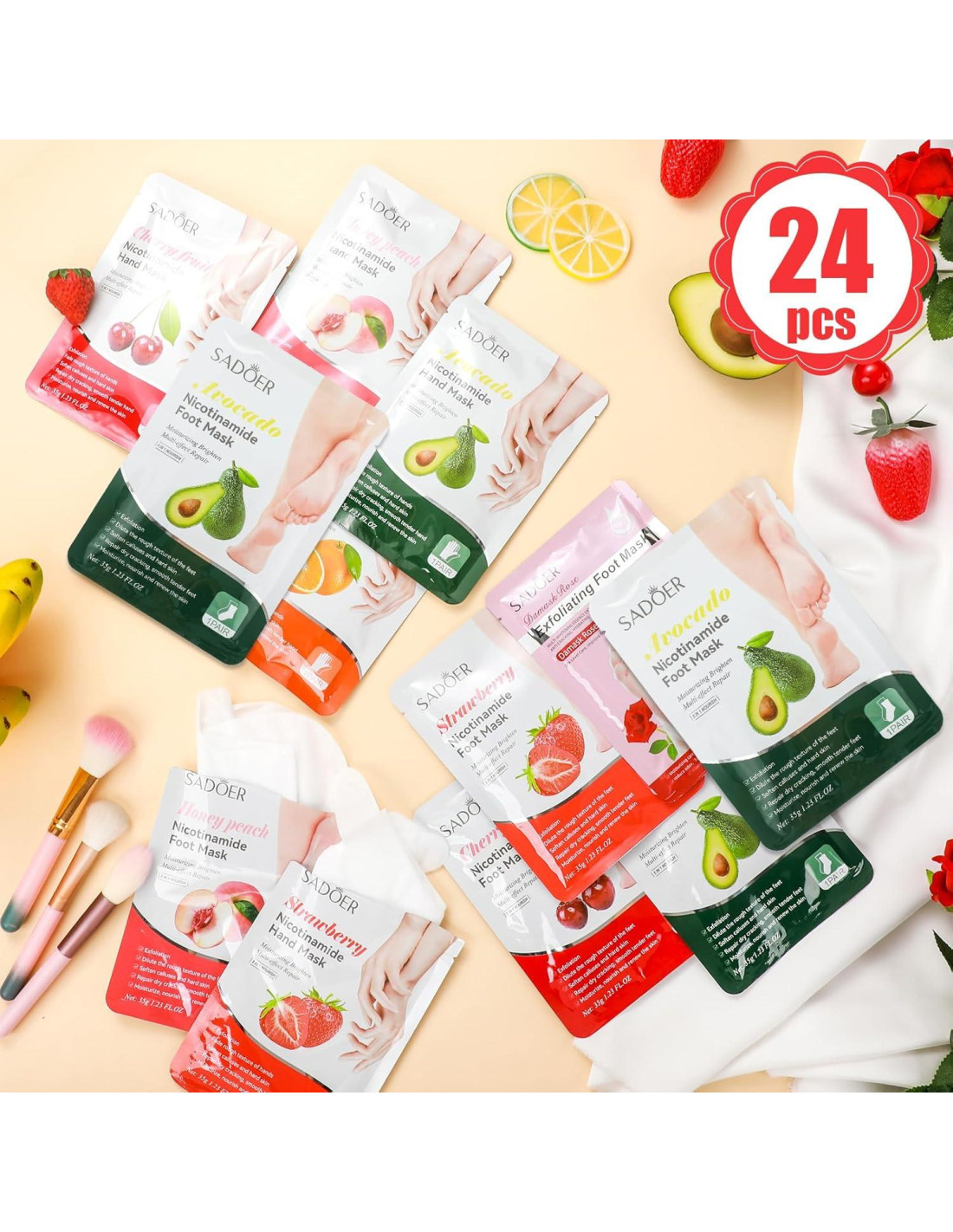 - Hidratación de la Piel: nuestra máscara para pies para mujeres puede humectar manos y pies todos los días; nuestras máscaras de manos de plantas y frutas incluyen 6 tipos, 2 piezas cada una, 12 piezas en un paquete; las máscaras para pies también incluyen 6 tipos, 2 piezas cada una, 12 piezas en total; el conjunto completo tiene un total de 24 piezas de productos, incluyendo cereza, fresa, durazno, aguacate, rosa y otros productos nutritivos.