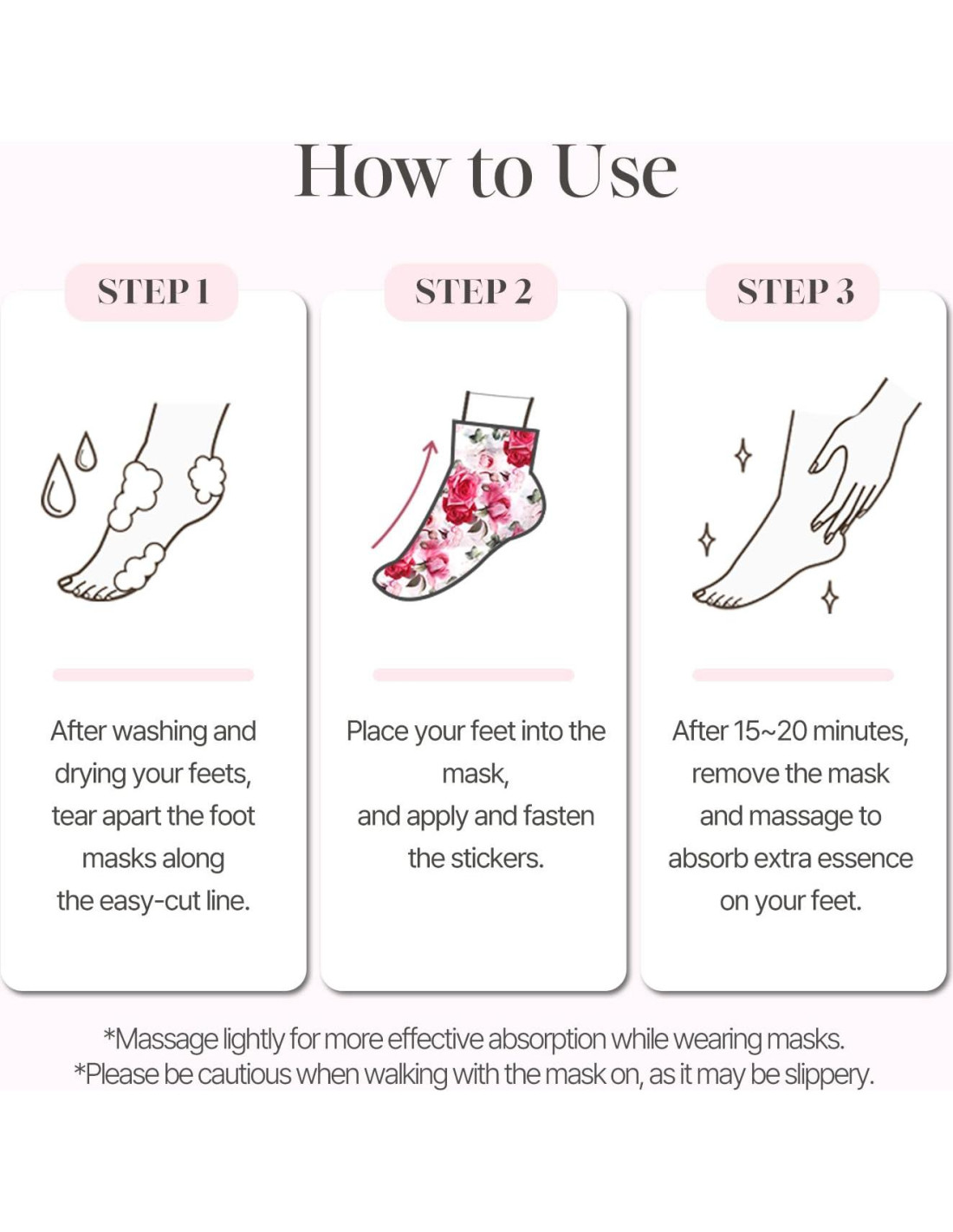 - Mascarilla de pies con esencia de rosa: Experimenta la lujosa hidratación de la mascarilla de pétalos de rosa Koelf, enriquecida con rica esencia de soufflé de rosa para hidratar y nutrir profundamente los pies secos y ásperos.