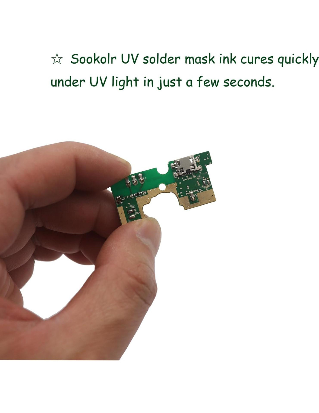 - La Tinta de Resistencia a la Soldadura que Cura con Luz UV Sookolr es un material de reparación para reparar el despegue o daño localizado de la capa de resistencia a la soldadura en placas de circuito PCB y cableado para computadoras, electrodomésticos y teléfonos celulares, así como cables voladores y fijación.