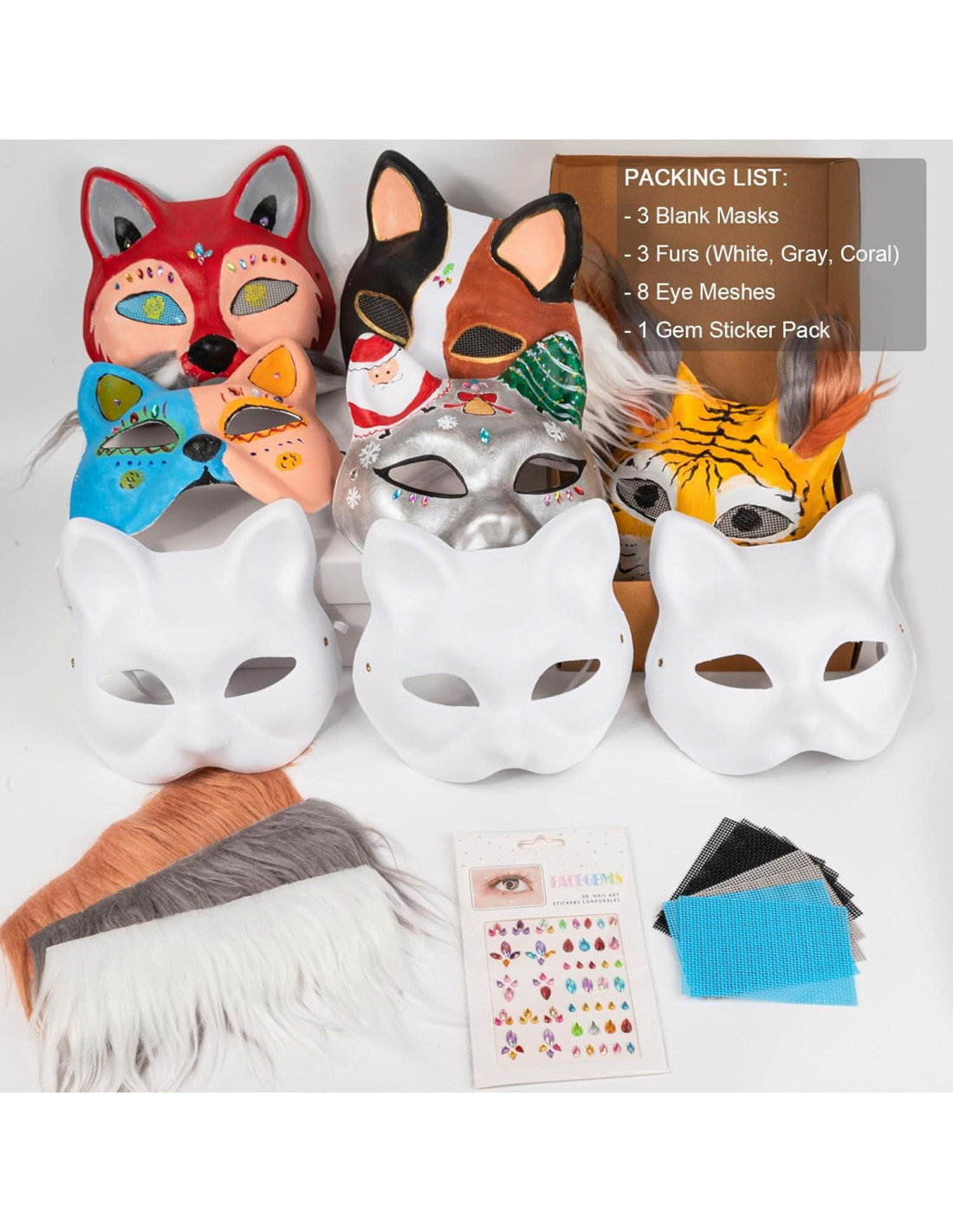 - [Diversión DIY con Accesorios] El paquete incluye 3 máscaras en blanco, 3 pieles (blanco, gris, coral), 8 mallas de ojos, 1 paquete de pegatinas de gemas, más conveniente para que hagas máscaras con estilos más diversos. Pigmento y pegamento no incluidos.