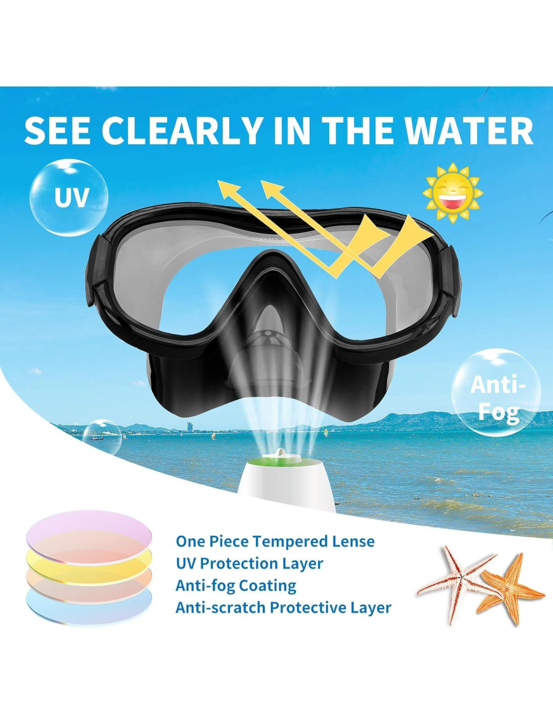 - Antivaho y a prueba de fugas--La máscara es de silicona de doble capa para prevenir fugas de agua y se ajusta mejor a la cara sin dejar marcas. Ideal para buceo y esnórquel, esta máscara de buceo profesional con falda de silicona ultra suave y hebillas laterales bien diseñadas se ajusta a cualquier forma de cara