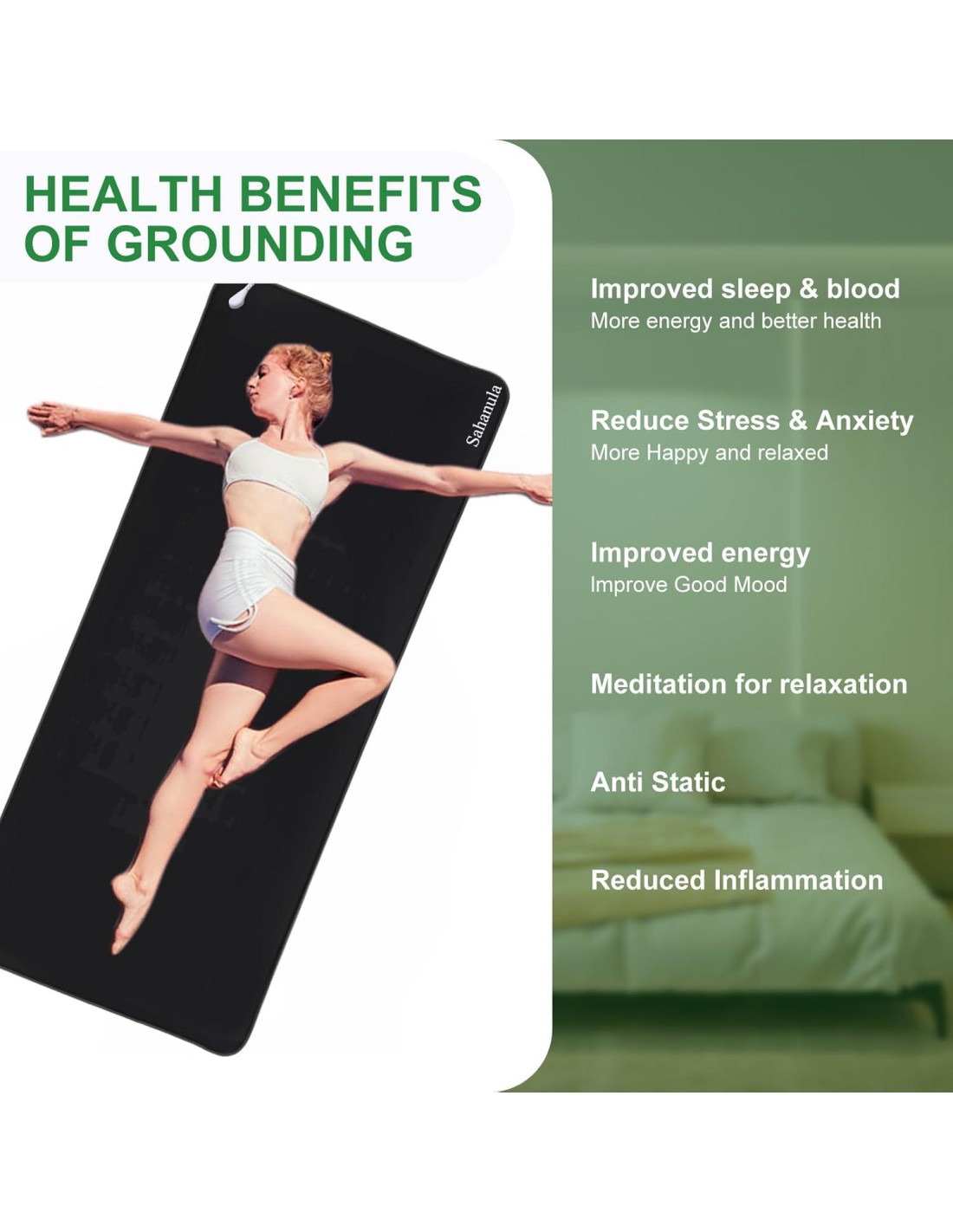 Sahanula, inspirada en la impresionante Montaña Saihanwula, vive bajo la idea de mantenerse cerca de la naturaleza y vivir de manera simple, todo arraigado en un profundo cuidado por la salud. Estamos dedicados a ofrecer a los consumidores una sensación de conexión a tierra más acogedora y saludable, impulsando formas naturales de equilibrar la electricidad del cuerpo, mejorar el sueño y aumentar el bienestar general. Con Sahanula, deja que el poder de la naturaleza te guíe por un camino fantástico hacia una vida más saludable. Cuida tu piel, ama tu vida. La conexión a tierra puede reducir significativamente la electricidad estática, protegiendo efectivamente tu piel y cabello, particularmente en entornos secos. Además, mejora la calidad del sueño, asegurando una noche más reparadora, y rejuvenece tu cuerpo con energía natural, dejándote sintiéndote revitalizado al día siguiente. Sahanula utiliza tecnología moderna y productos innovadores para ayudar a las personas a disfrutar de un estilo de vida más cómodo y saludable. Ayuda a equilibrar la energía del cuerpo, mejora la calidad del sueño y, por lo tanto, mejora las condiciones de salud en general. ¿QUÉ ES LA CONEXIÓN A TIERRA? Cuando tocas el suelo, electrones negativos transportados por la tierra fluyen hacia tu cuerpo, disipando la electricidad estática y otras cargas ambientales. Este proceso se conoce como conexión a tierra. ¿POR QUÉ LA CONEXIÓN A TIERRA? La conexión a tierra tiene muchos beneficios para la salud, incluyendo el equilibrio de la circulación sanguínea, la mejora del sueño, la reducción de la inflamación, la reducción del estrés/ansiedad/irritabilidad y el impulso del sistema inmunológico. ¿CÓMO PROBAR? 1. Probado con el bolígrafo de prueba proporcionado, la luz indicadora de prueba se enciende y la almohadilla de conexión a tierra es conductora. 2. Usando un multímetro para probar, antes de la conexión a tierra, nuestro voltaje corporal es 4.89V, pero después de la conexión a tierra, nuestro voltaje corporal cae a 0.00V. ¿CÓMO USAR? 1. Conecta el extremo de presión del cable a tu producto de conexión a tierra, asegurándote de que el lado de cuero suave esté hacia arriba. Conecta el cable a un puerto de tierra o a un cable de varilla de conexión a tierra. 2. Toca la almohadilla de conexión a tierra con tu piel desnuda (manos o pies). ¿CÓMO LIMPIAR? Si hay una mancha en la alfombrilla de conexión a tierra, simplemente límpiala con un paño húmedo. Alfombrilla de Conexión a Tierra. Sábanas de Conexión a Tierra Rey. Alfombrilla de Yoga de Conexión a Tierra. Sábanas de Conexión a Tierra Reina.