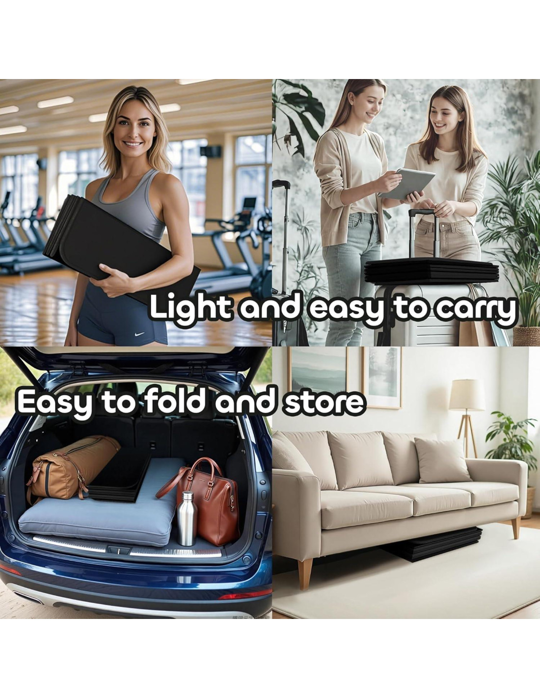 - Diseño de Plegado en 3 Segundos: Se pliega rápidamente a un tamaño compacto en 3 segundos. El diseño pre-plegado se colapsa ordenadamente para bolsas de gimnasio, viajes o espacios reducidos, mientras que el material POE duradero resiste el plegado. Almacenamiento fácil, sin estiramientos.