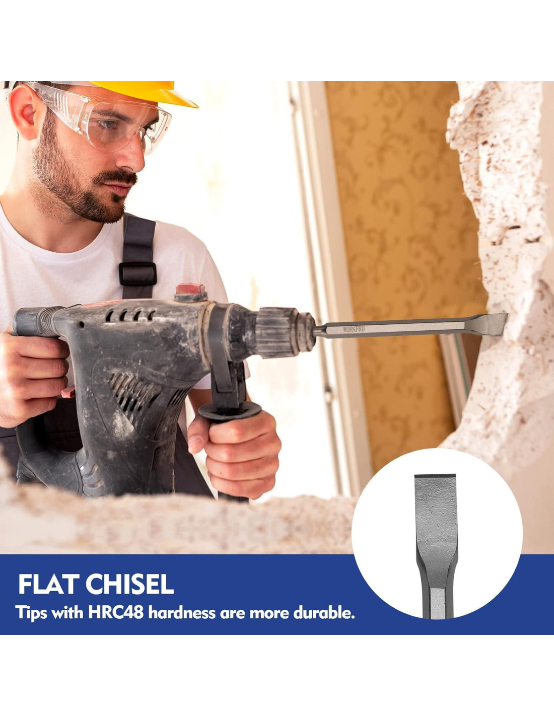 - El juego incluye: 12 brocas en 4 grupos de diferentes longitudes y tamaños; 2 cinceles puntiagudos, 3 cinceles planos y un estuche de almacenamiento