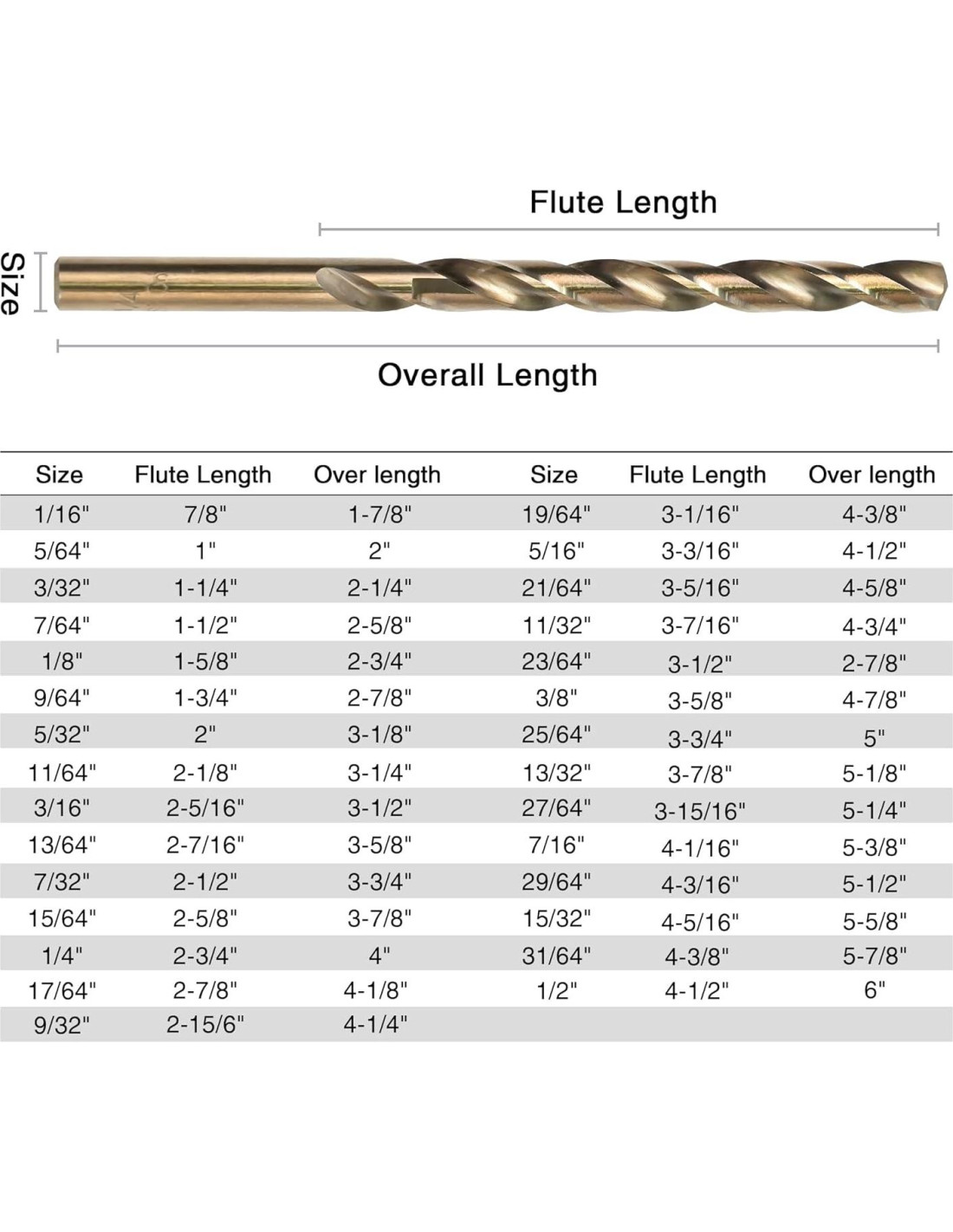 - El Juego Incluye: 1/16, 5/64, 3/32, 7/64, 1/8, 9/64, 5/32, 11/64, 3/16, 13/64, 7/32, 15/64, 1/4, 17/64, 9/32, 19/64, 5/16, 21/64, 11/32, 23/64, 3/8, 25/64, 13/32, 27/64, 7/16, 29/64, 15/32, 31/64 y brocas de 1/2 pulgadas; Viene en una caja de almacenamiento indexada de metal para un fácil almacenamiento