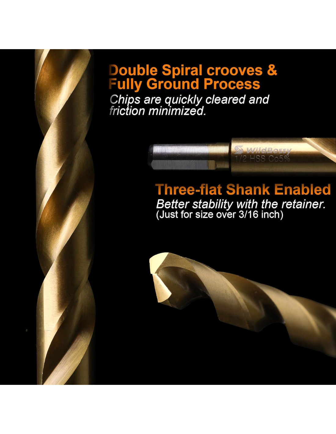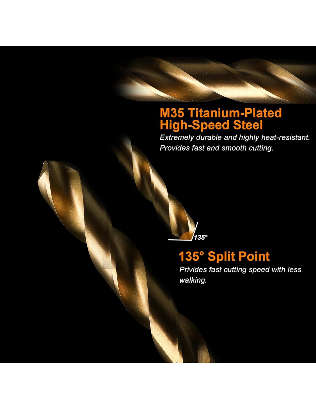 - Juego de BROCAS DE GIRO DE 5% COBALTO Hecho de Acero Cobalto M35 con Molibdeno y Cobalto añadidos para formar una aleación endurecida, puede medir hasta 67 de dureza Rockwell, corta más rápido, dura más y dura más que las brocas HSS normales 12 veces.