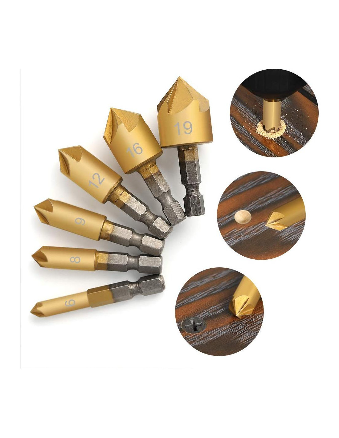 - EL PAQUETE INCLUYE: 6 piezas de brocas de tamaño: 6 mm (1/4''), 8 mm (5/16''), 9 mm (3/8''), 12 mm (1/2''), 16 mm (5/8''), 19 mm (3/4''); 1 pieza de punzón central.
