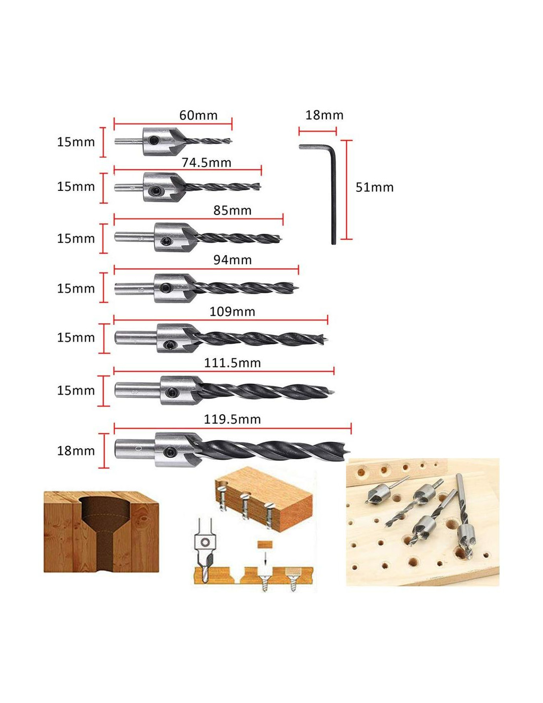 - 7 piezas de brocas de avellanado de tres puntas hechas de acero de alta velocidad con buena resistencia a la abrasión y confiables, incluye 3mm, 4mm, 5mm, 6mm, 7mm, 8mm, 10mm para perforar agujeros piloto, la broca de gran flauta de virutas y cinco chaflanes permite una descarga más rápida y fácil de aserrín.