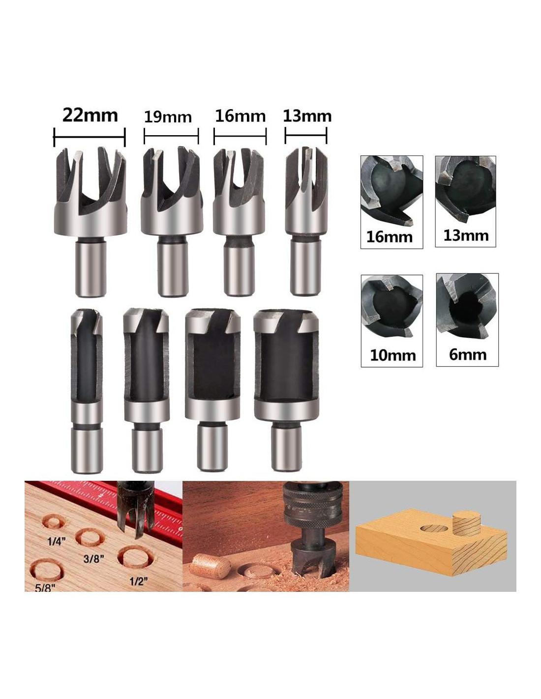 - Juego de 8 piezas de cortadores de tapones de madera de vástago de 3/8" hecho de material de acero al carbono confiable, utilizado para tapones de madera cónicos de 1/4", 3/8", 1/2", 5/8" para cubrir agujeros de tornillos empotrados o ocultar imperfecciones, capaz de cortar tapones de 22mm/23mm/25mm/26mm de longitud.