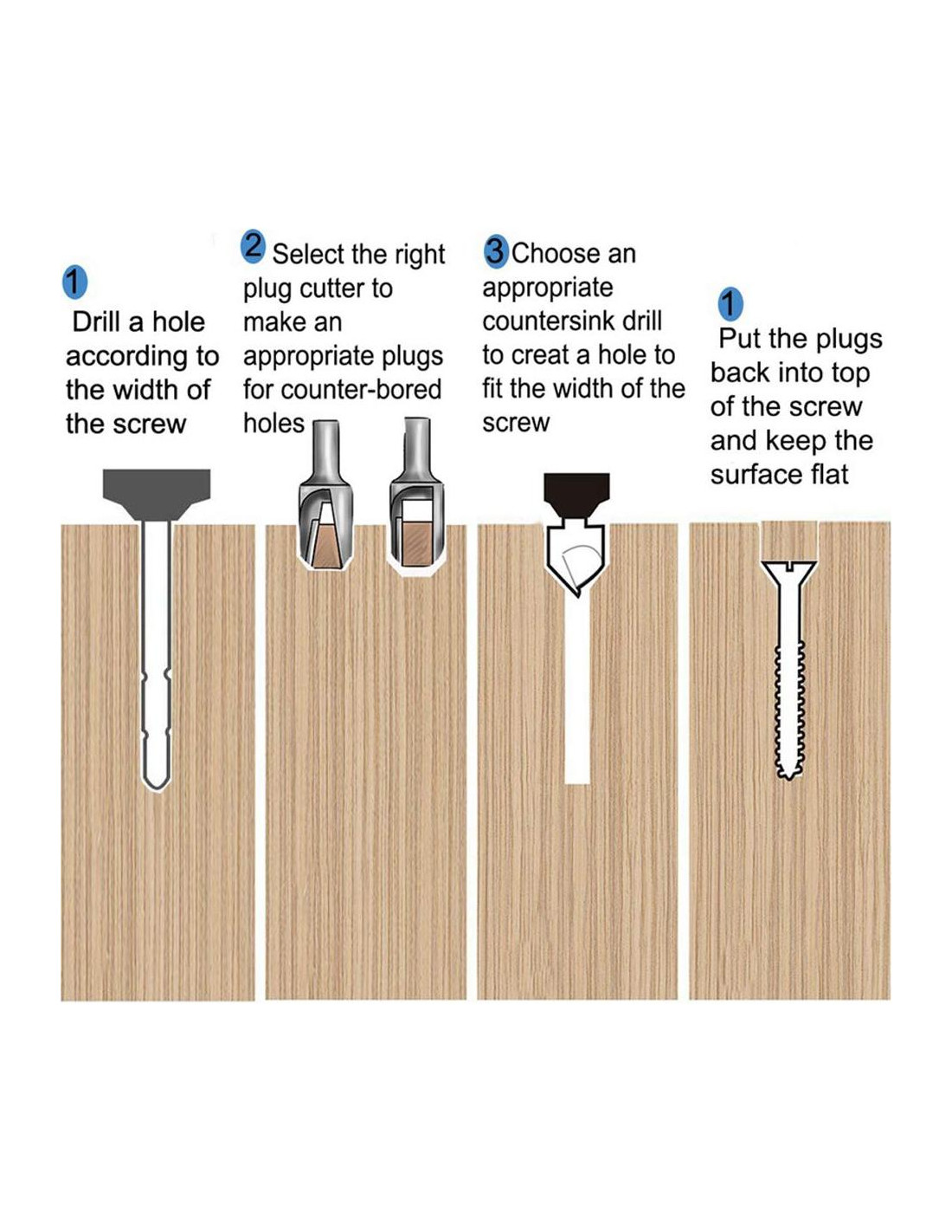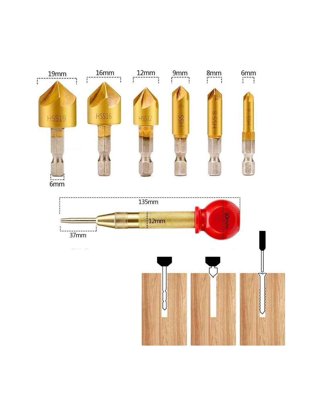 - El paquete incluye 23 piezas de herramientas de avellanado para carpintería, 6 piezas de 1/4" vástago hexagonal HSS 5 flautas 90 grados brocas de avellanado, 7 piezas de broca de avellanado de acero de alta velocidad de tres puntas con una llave en L para perforación de madera o avellanado de carpintería, 8 piezas de juego de brocas cortadoras de tapones de madera y 1 pieza de punzón de centro automático para marcar la pieza de trabajo con un punto, creando un punto de inicio que evita que los tornillos y las brocas se desvíen